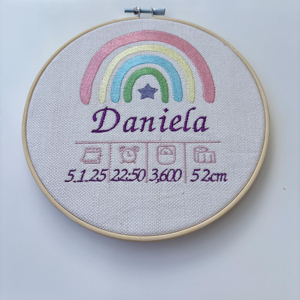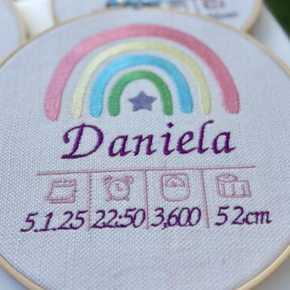 🌈✨ Bastidor de nacimiento personalizado – Modelo Arcoíris Estrella ✨🌈 Un recuerdo lleno de color y ternura para celebrar la llegada de tu bebé 💕 Cada bastidor es bordado con mimo, incluyendo su nombre, fecha, hora, peso y medida al nacer. 🎨 5 Colores suaves y personalizables 📏 Ideal para decorar la habitación del bebé 🎁 Regalo perfecto para recién nacidos o baby showers 💬 Personaliza el tuyo con los datos de tu peque o sorprende a alguien especial.