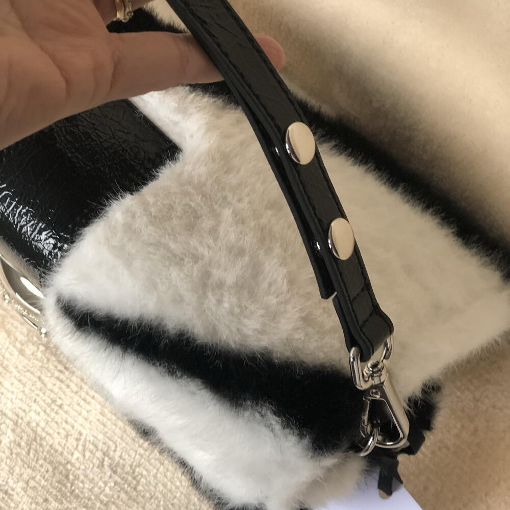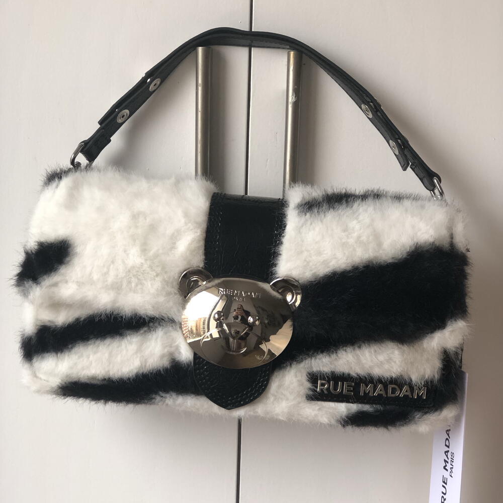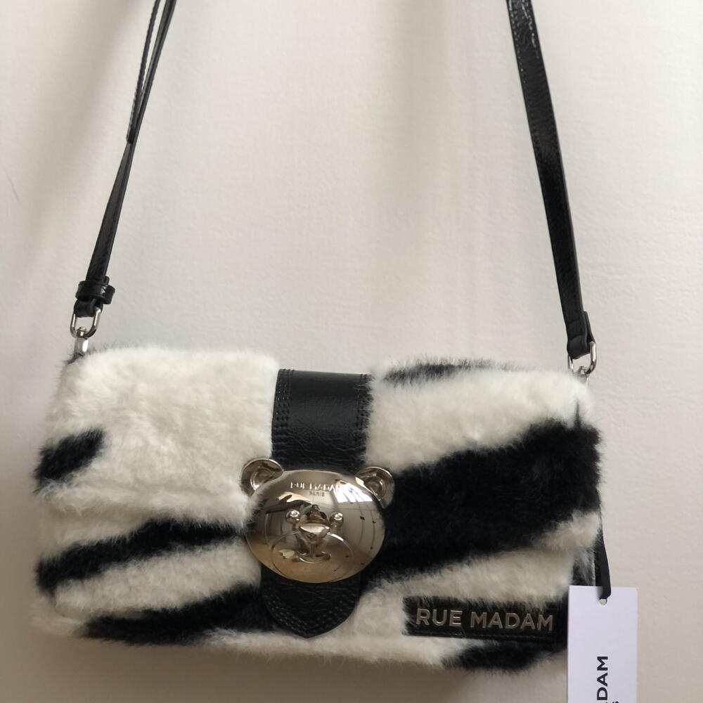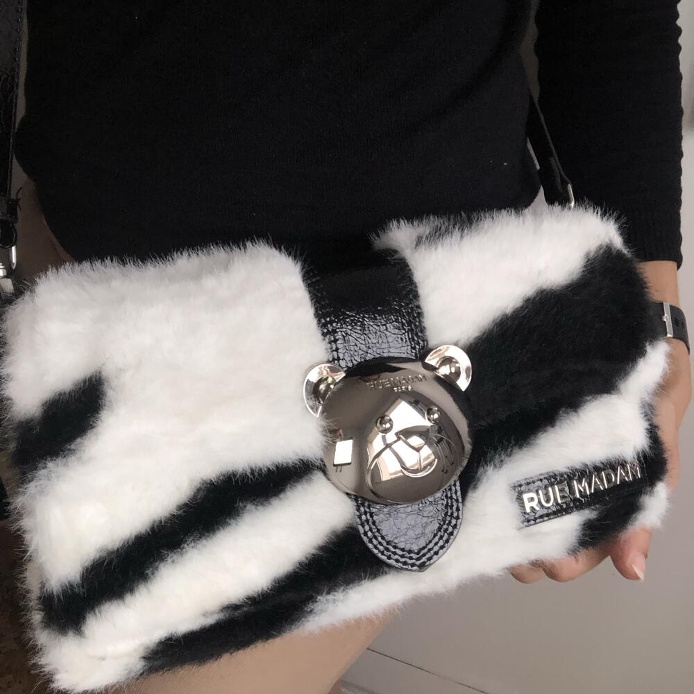 Bolso cartera marca Rue Madam Paris Peludo, efecto cebra blanco y negro. Detalle llamativo de oso Teddy en metal plateado y brillante.