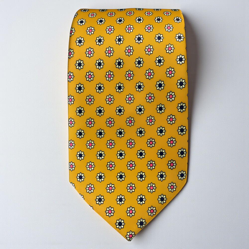 Corbata 100% seda — elegancia en cada nudo. Con un diseño único en amarillo y estampado de flores aporta a tu estilo un toque de distinción