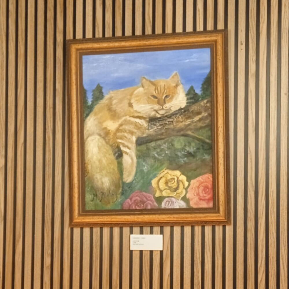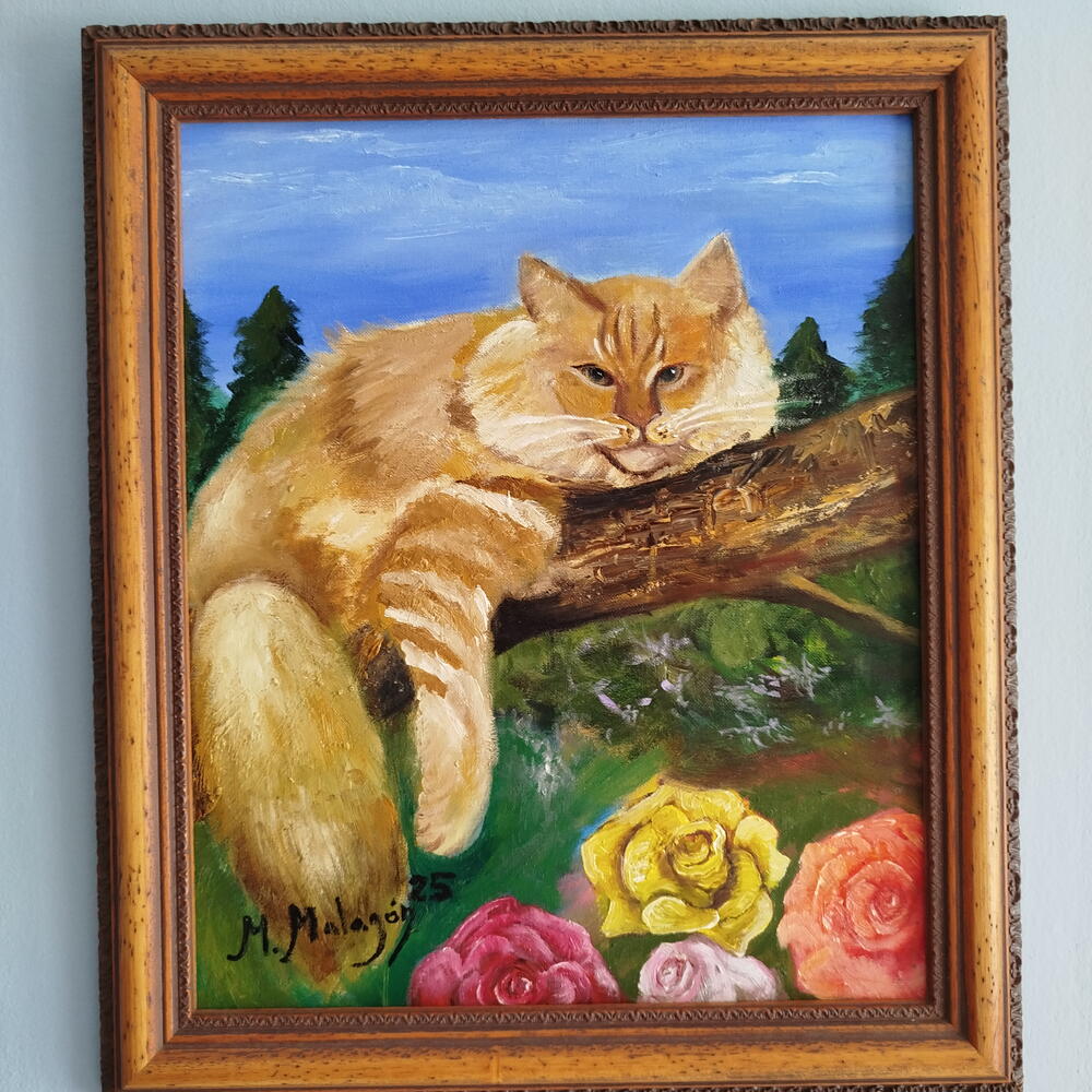 Es un óleo sobre lienzo, pintado con técnica impresionista moderna, casi naif, basado en un retrato de mi gatito Maine coon, Lorenzo. Está echado sobre la rama de un árbol, y completan la composición unas rosas.
