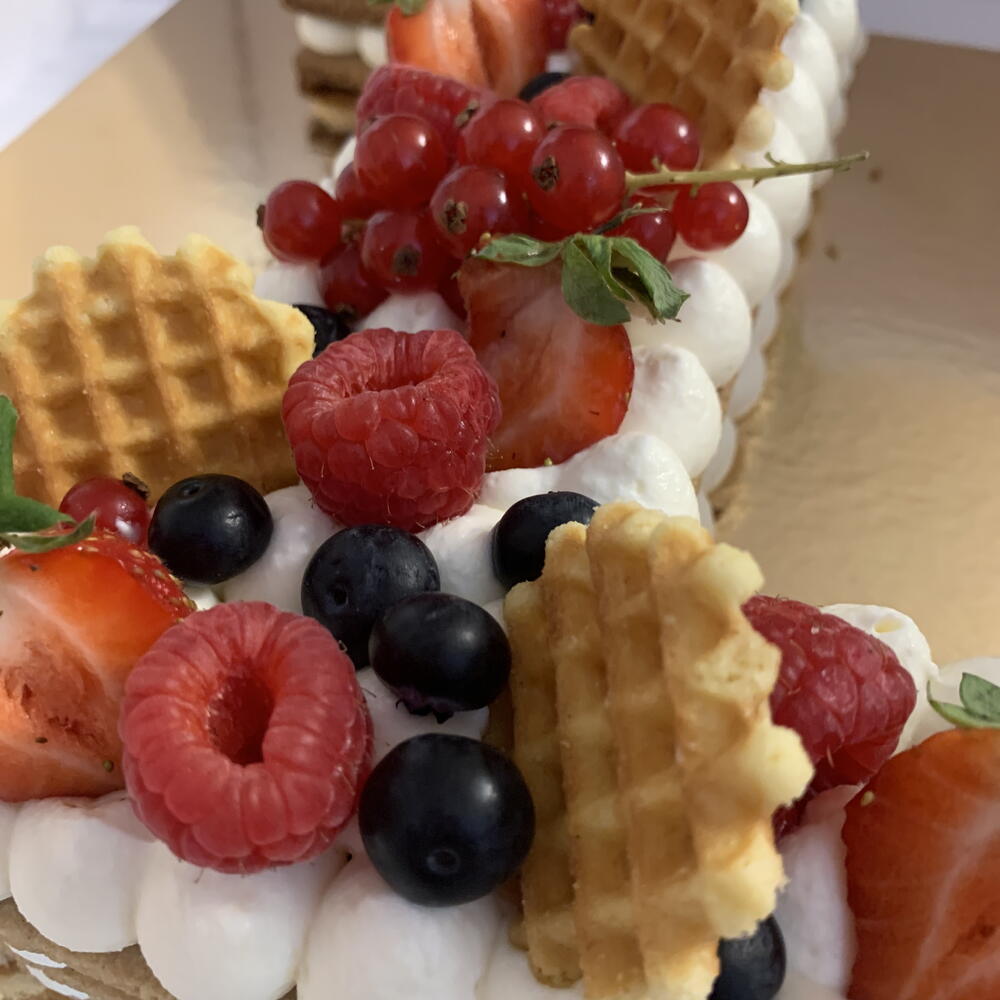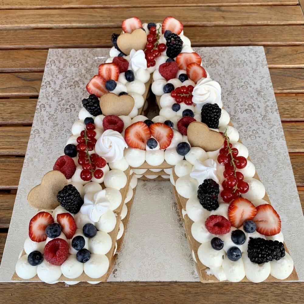 Tarta en forma de letra A, elaborada con capas de galleta crujiente y crema suave de vainilla. Decorada con frutas frescas como fresas, frambuesas, moras, arándanos, además de galletas en forma de corazón . Un pastel creativo y festivo, perfecto para personalizar celebraciones especiales. Podemos personalizar a tu gusto. ( si quieres cambiar la letra comunícalo a la tienda)