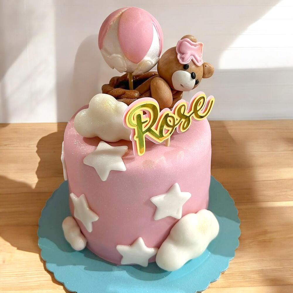 Celebra con ternura y fantasía el cumpleaños de tu pequeña Rose con esta encantadora torta de temática aérea. Con un diseño delicado en tonos rosados y decorada con un globo aerostático y un osito de peluche, esta torta es ideal para quienes buscan una celebración mágica. Las nubes y estrellas de azúcar añaden un toque onírico que hará que su día sea aún más especial. El nombre Rose en la parte superior le da un detalle personal y único. Este pastel no solo es un deleite visual, sino también un manjar delicioso para compartir en su gran día. ¡Haz que su fiesta sea memorable con esta creación llena de dulzura y encanto!