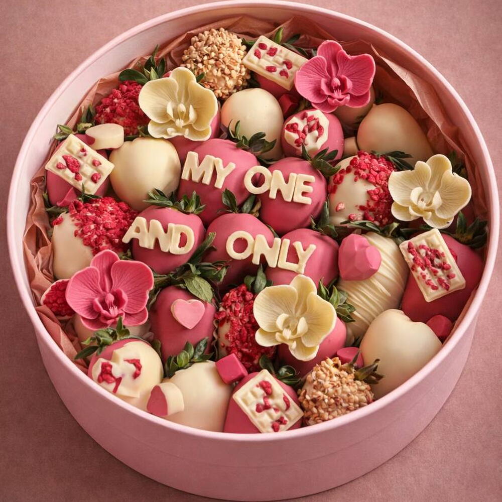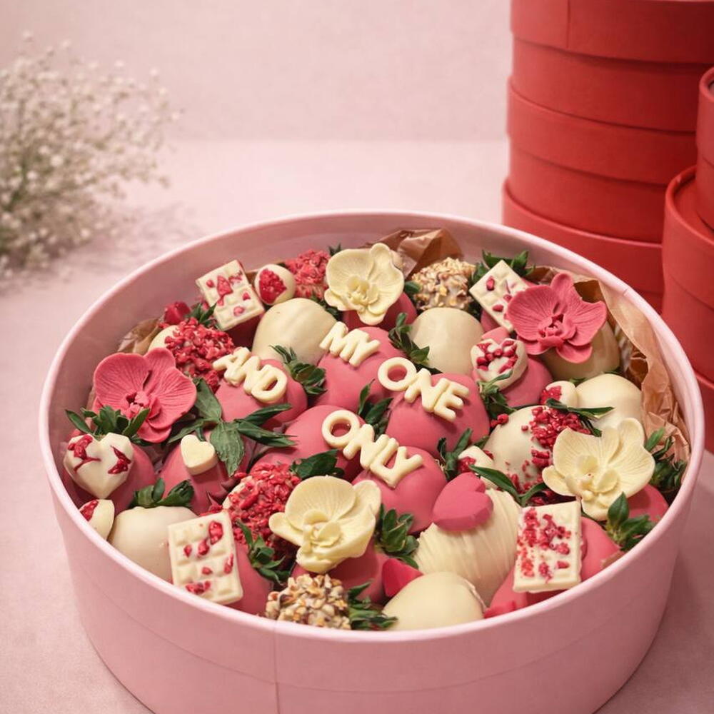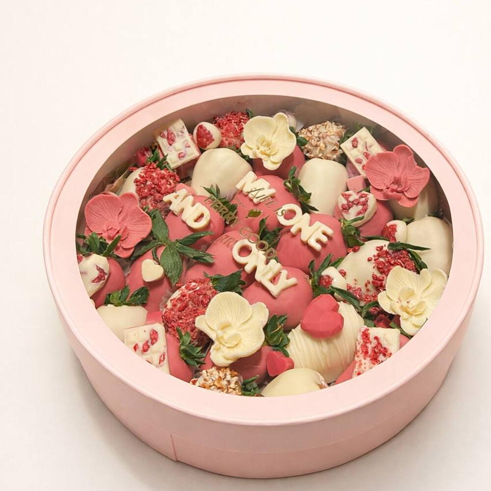 Cuando quieres dejarlo clarísimo. Berry One Only Box es nuestra caja circular grande (30 cm) con unas 45 fresas (según calibre) bañadas en chocolate y decoradas en estilo romántico premium: corazones, detalles crujientes, berries y piezas de chocolate para dar contraste y textura. En el centro, el mensaje protagonista (en la foto: “MY ONE AND ONLY”), perfecto para San Valentín o aniversario. Como siempre, es 100 % customizable: puedes cambiar la frase (en cualquier idioma), colores, temática, estilo decorativo (más minimal o más “full”), combinación de chocolates y toppings para que sea literalmente vuestra caja. La cantidad de fresas es orientativa y puede variar según el calibre. Y, por supuesto, todo es gluten free.
