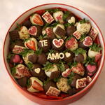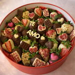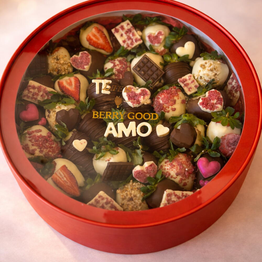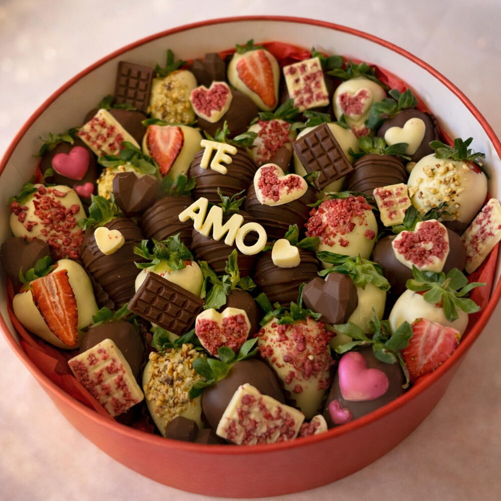 Directa, romántica y con “wow factor”. La Berry Te Amo Box es una caja circular cargada de fresas bañadas en chocolate (blanco, con leche y/o negro), detalles en forma de corazón, toppings crujientes y un mensaje central en chocolate que lo dice todo: TE AMO. 100 % customizable: cambia el texto, el idioma, los colores, el estilo (más minimal o más full toppings) y la temática (San Valentín, aniversario, pedida, “lo siento”, lo que sea). Tú pones la intención; nosotros lo convertimos en regalo. Y, por supuesto, todo es gluten free.