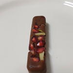 Bombon de chocolate con frutos secos y semillas de granada decorado con pan de oro comestible