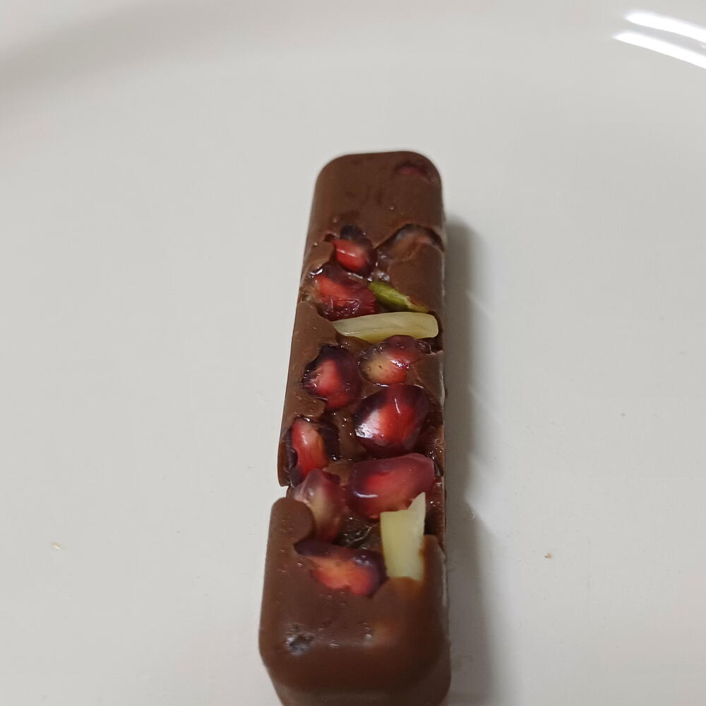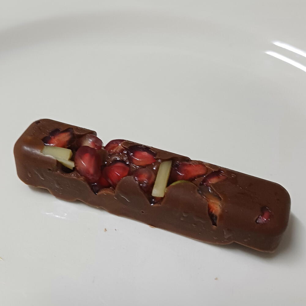 Chocolate con leche (cacao, manteca de cacao, leche en polvo, azúcar) Frutos secos (almendra, avellana, pistacho Semillas de granada
