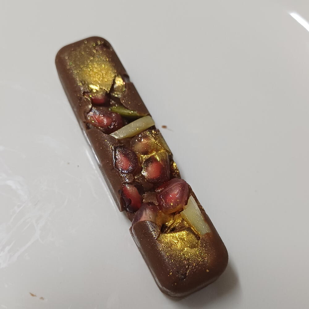 Bombon de chocolate con frutos secos y semillas de granada decorado con pan de oro comestible