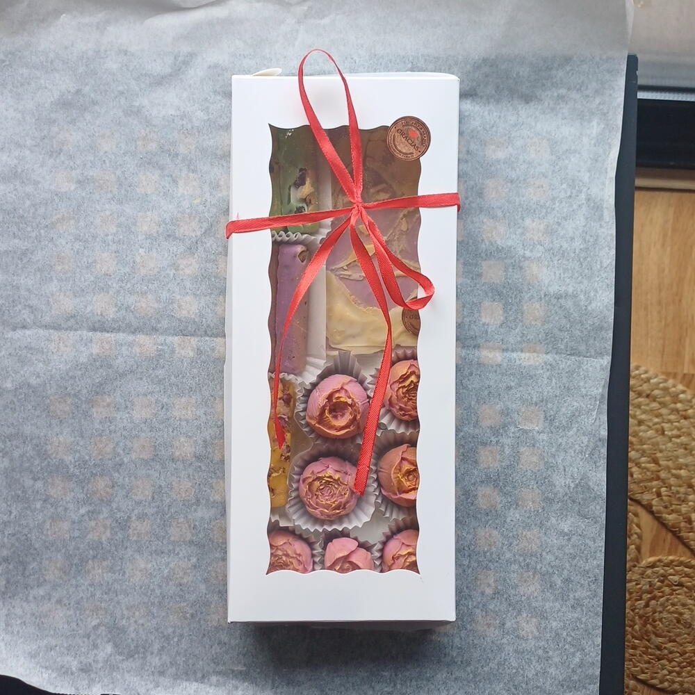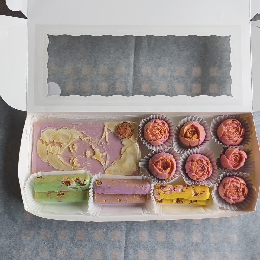 Edición Especial 🌸 Delicada, elegante y hecha a mano con mucho amor 💕 Esta caja combina arte y sabor en cada detalle. Incluye: 🍫 1 tableta artesanal de chocolate ruby y chocolate blanco con diseño artístico 120g 🌹 7 bombones en forma de rosa, pintados a mano 🍬 6 mini barritas de chocolate en diferentes sabores y colores Elaborados con chocolate de alta calidad, con rellenos suaves y decoraciones florales comestibles que convierten cada pieza en una pequeña obra de arte. Perfecto para: 🎁 Regalo romántico 🌷 Cumpleaños 💐 Día especial ✨ Detalle elegante y original 📦 Presentado en caja blanca con ventana transparente, lista para regalar.