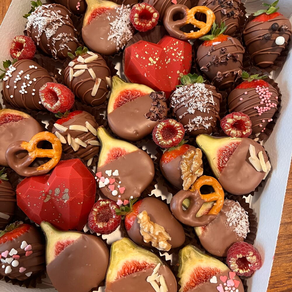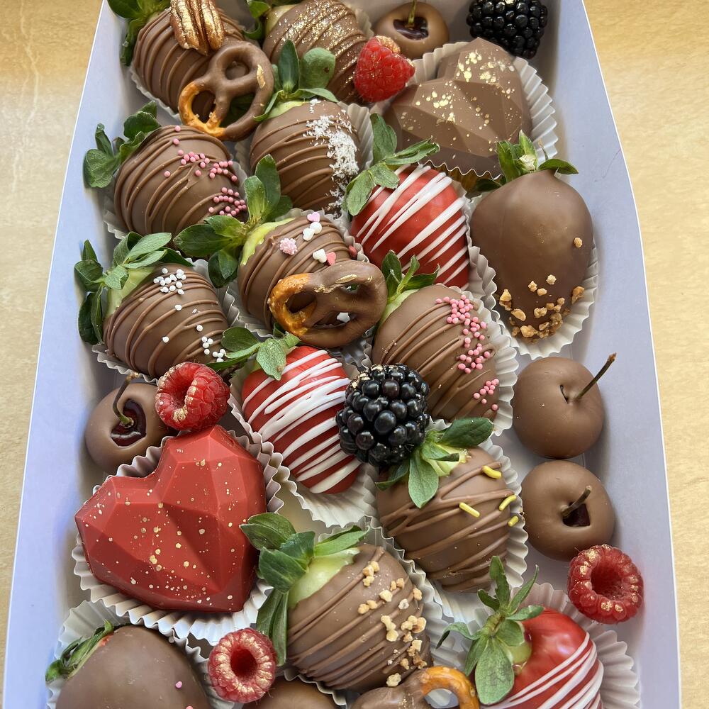 Caja rectangular con fresas bañadas en chocolate, bombones rellenos, pretzels, frutas variadas, cerezas con chocolate. Se puede escoger el chocolate entre, chocolate blanco, chocolate negro, chocolate de leche o chalote rubí, puede contener frutos secos, las frutas pueden variar según temporada. Se recomienda consumir máximo en 48 horas ya que es un producto fresco, se debe mantener refrigerado. este producto se puede personalizar. Cantidad de fresas (14 a 16).