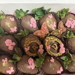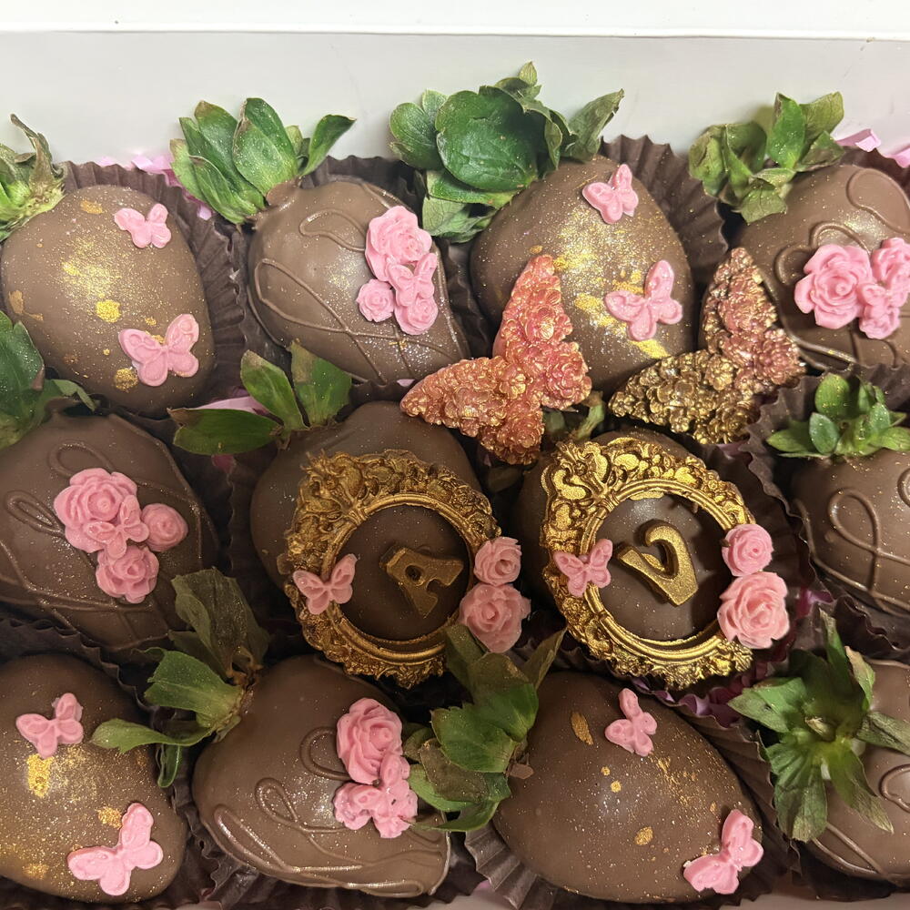 Una presentación delicada y sofisticada, elaborada con fresas frescas seleccionadas y bañadas en chocolate de alta calidad. Cada pieza está decorada a mano con detalles florales en tonos rosados y acabados dorados, pensados para crear una experiencia visual y de sabor