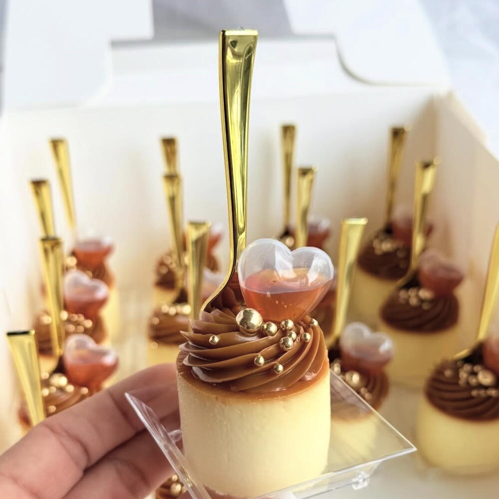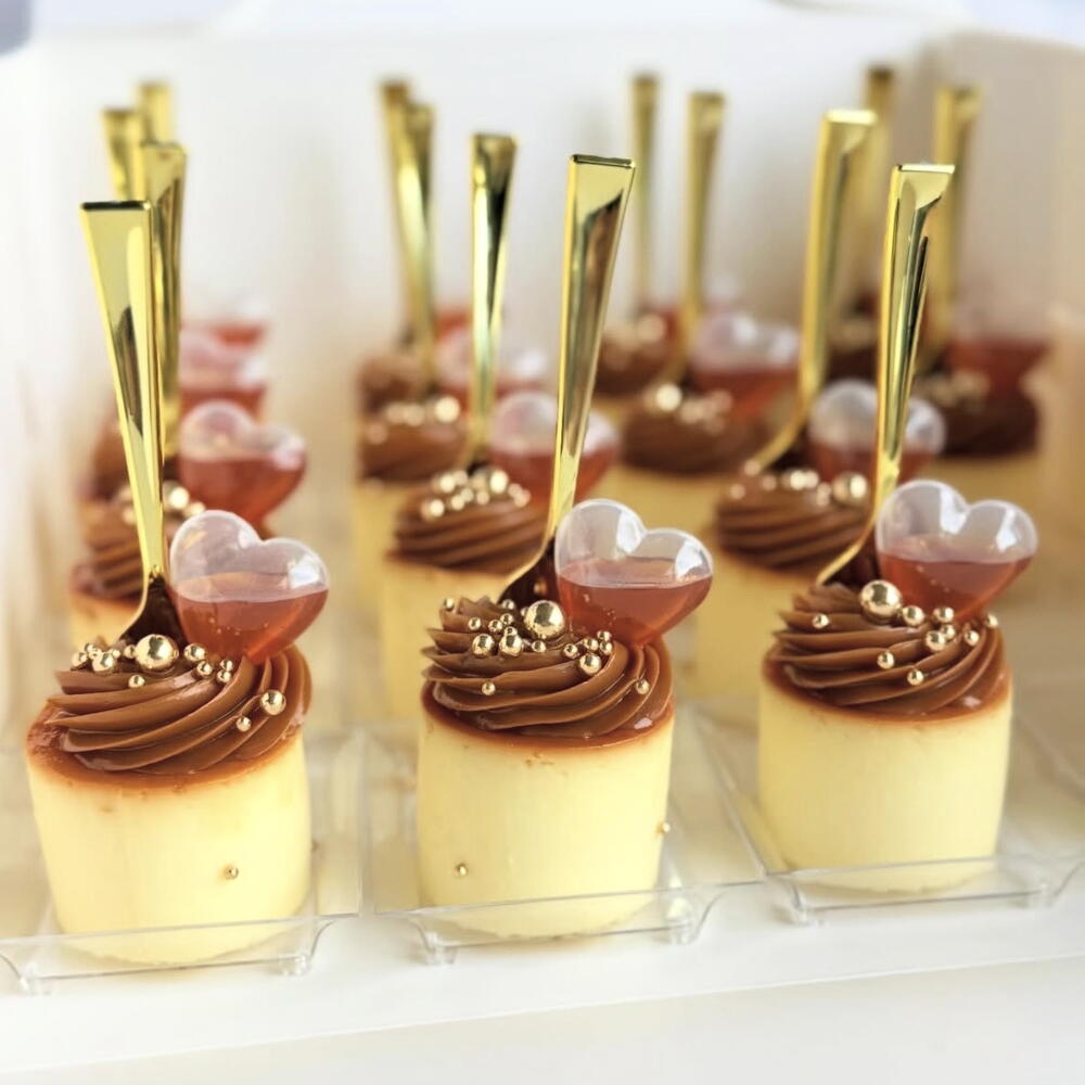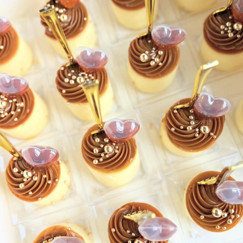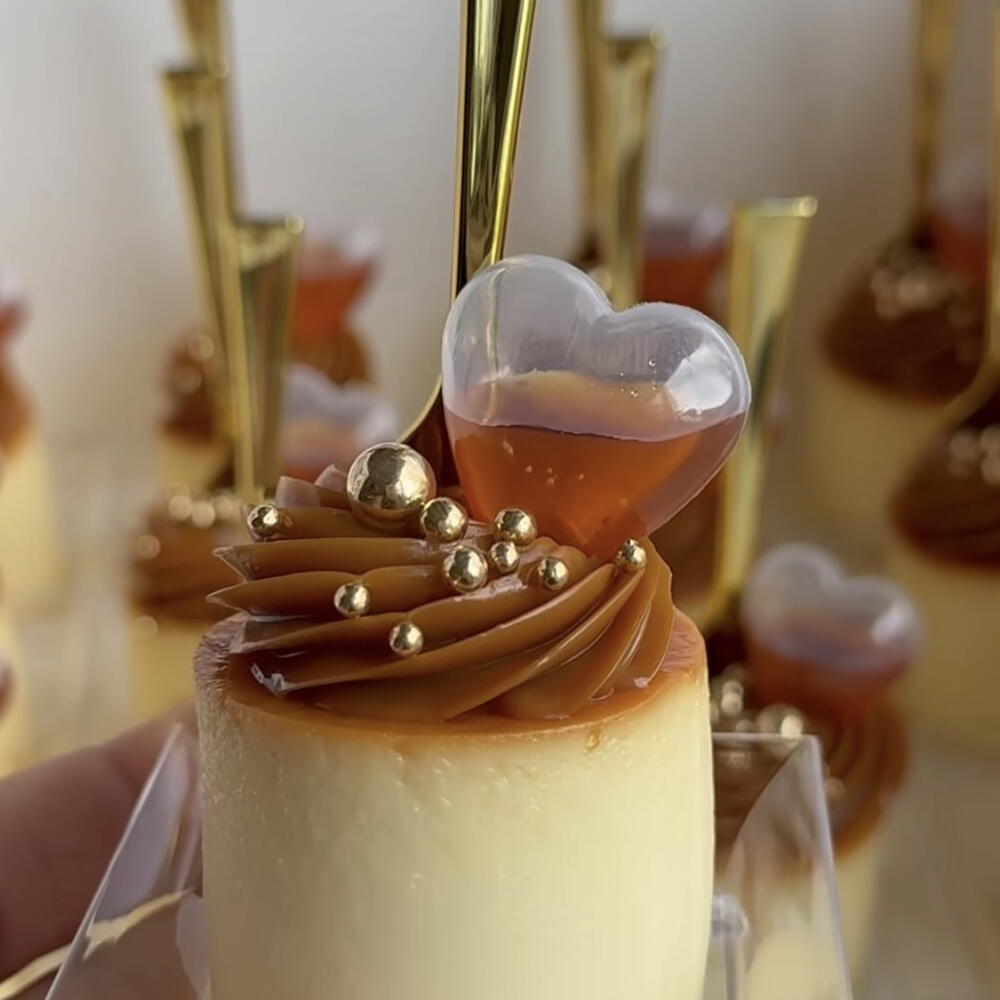 Eleva cualquier celebración con nuestros exclusivos mini flanes gourmet. Una textura sedosa que se funde en el paladar, coronada con un delicado remolino de dulce de leche, perlas doradas comestibles y un corazón de caramelo artesanal.
