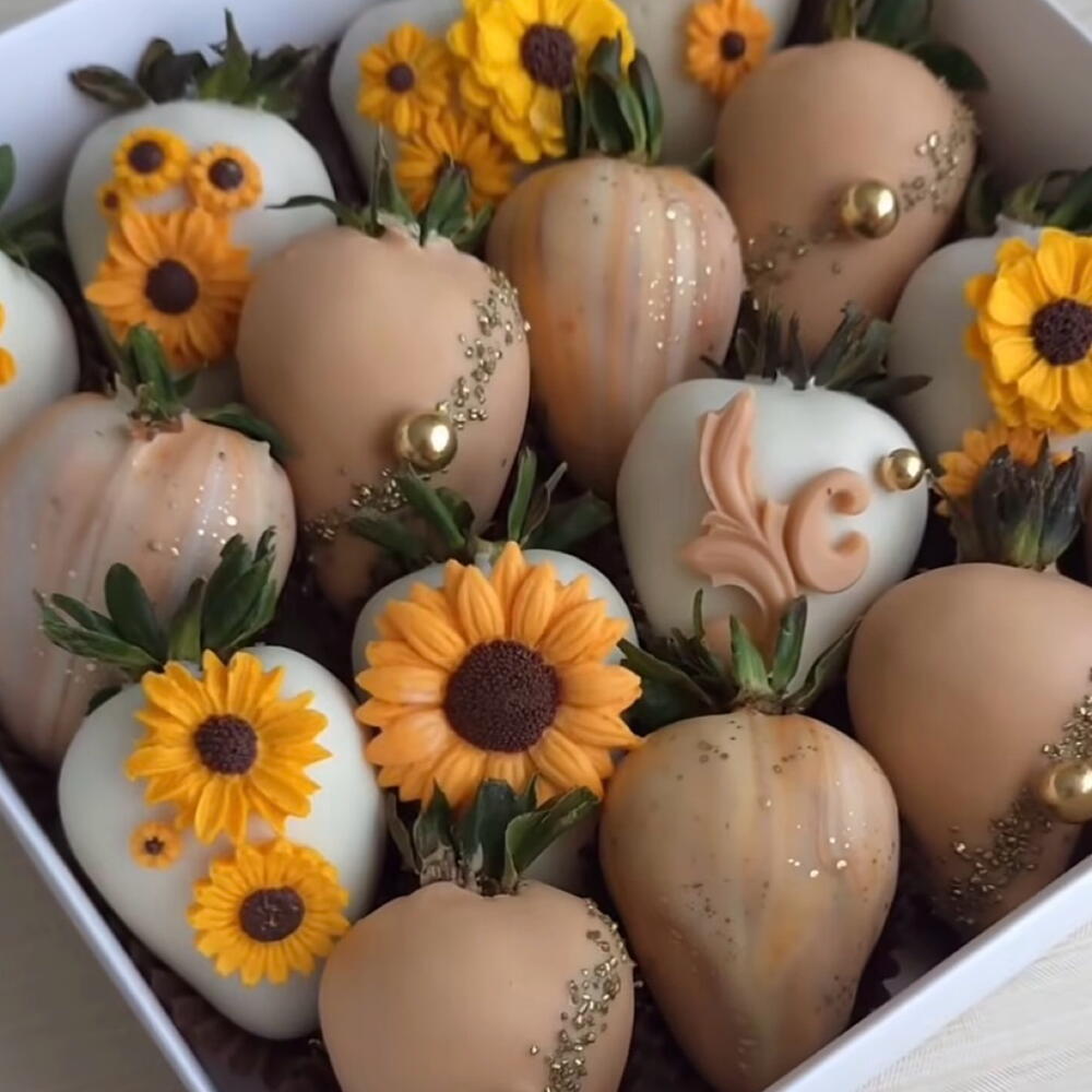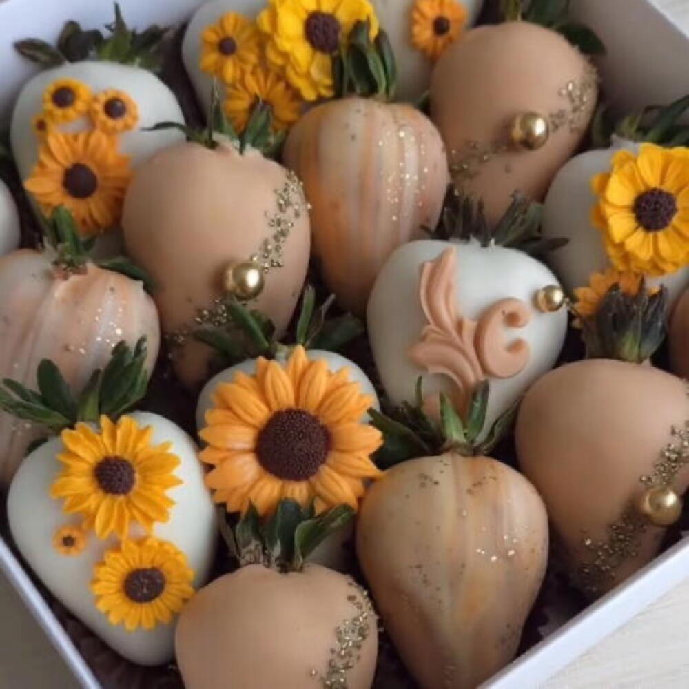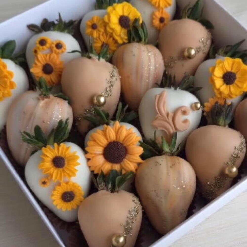 Fresas frescas Chocolate blanco teñido de café Chocolate blanco Girasoles hecho en chocolate