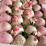 Esta exquisita caja de regalo presenta fresas frescas y jugosas, meticulosamente sumergidas a mano en una lujosa cobertura de chocolate rosa pastel y blanco. Con un diseño elegante y romántico, cada fresa es una obra de arte, adornada con intrincados patrones de remolinos de chocolate, delicadas flores de azúcar rosa, mariposas comestibles detalladas y sutiles perlas de azúcar de color rosa y dorado. Este arreglo premium ofrece una cautivadora mezcla de sabores y texturas, perfecto para expresar amor, gratitud o celebrar hitos especiales. Es un regalo inolvidable que seguramente encantará a su destinatario con su belleza y sabor.