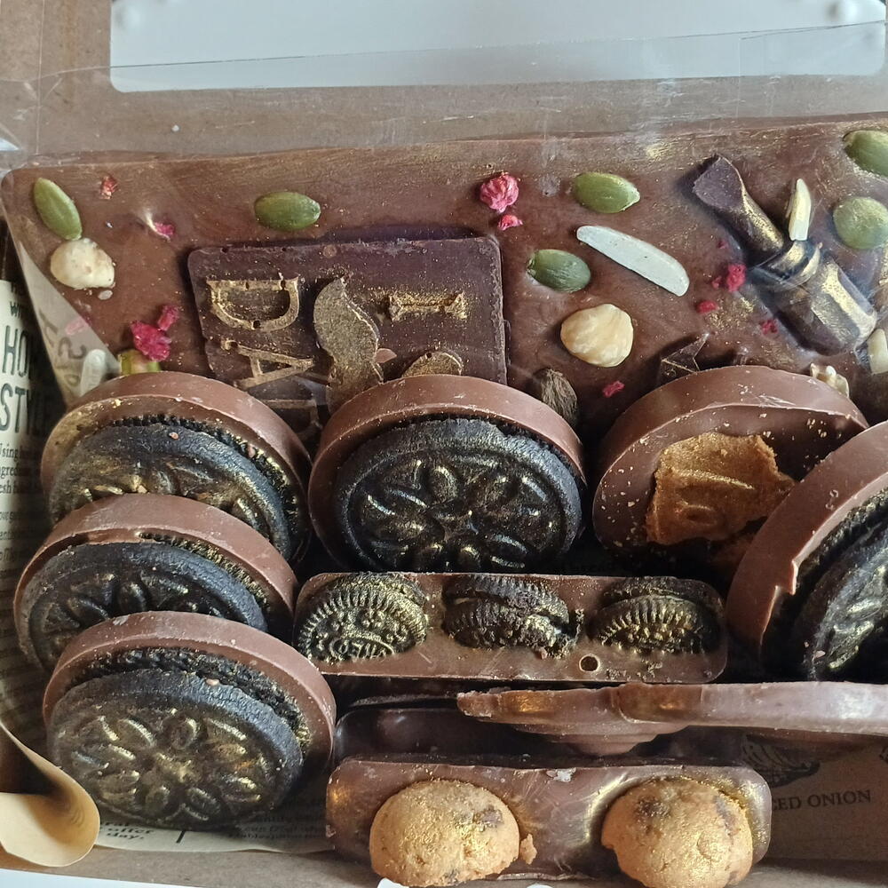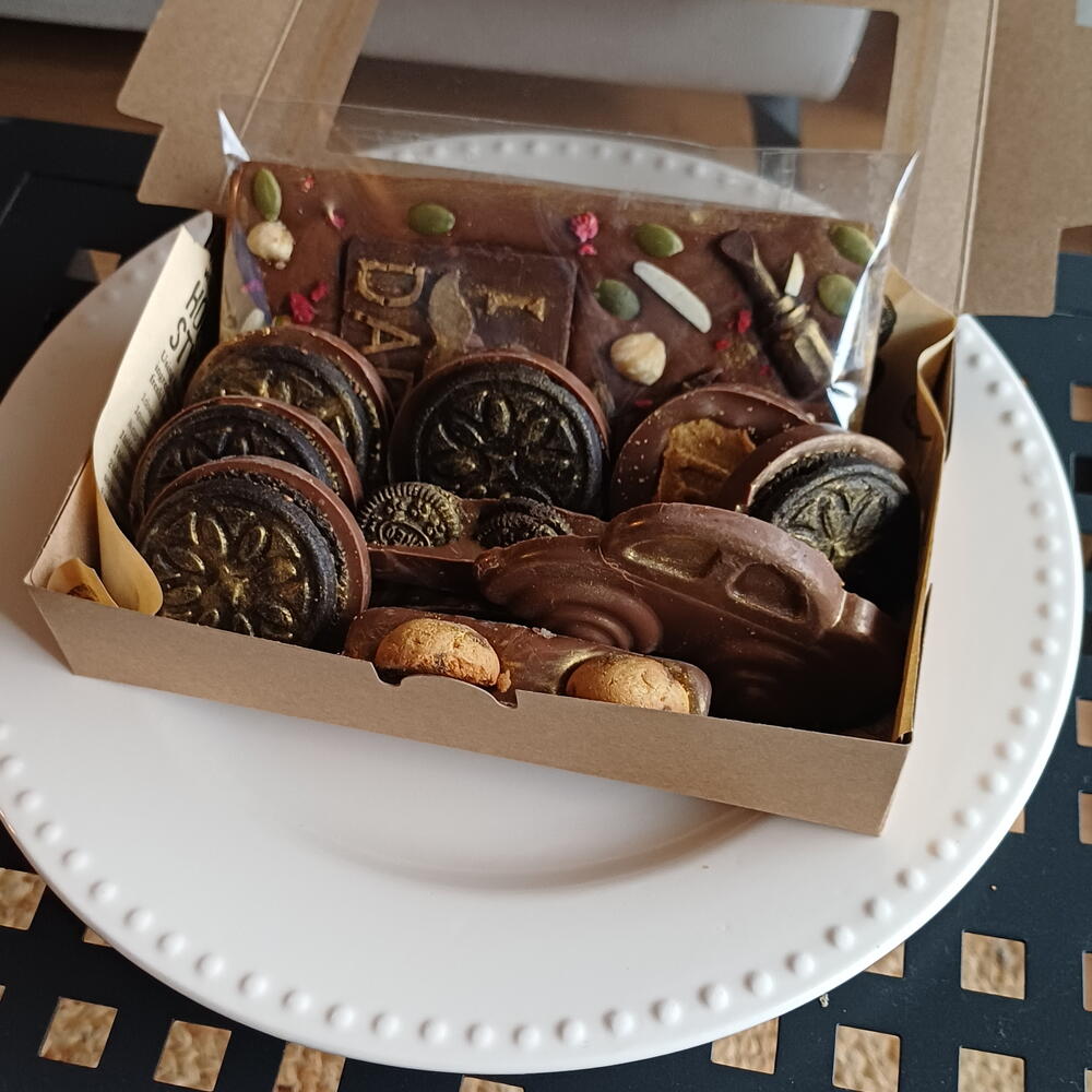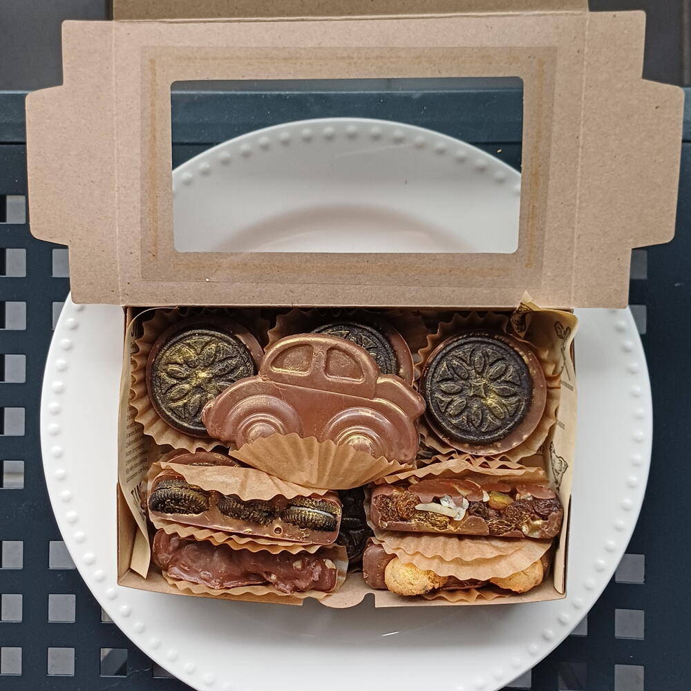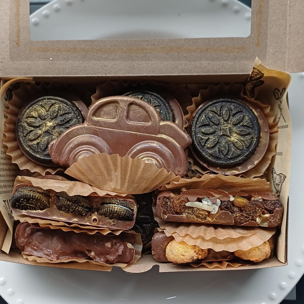 "¡Hecho con todo el amor del mundo para mi héroe favorito! 💛🔧 Esta tableta de chocolate artesanal con 'I ❤️ DAD' y su bigote dorado, rodeada de herramientas, tuercas y frutos secos que tanto le gustan… porque papá siempre está arreglando todo, ¡hasta nuestros días! Y para completar el detalle: bombones con formas de coche clásico 🚗, barritas crujientes con Oreo , y más sorpresas llenas de sabor y cariño. Porque un papá como el mío merece lo mejor, no solo en su día ,sino siempre.