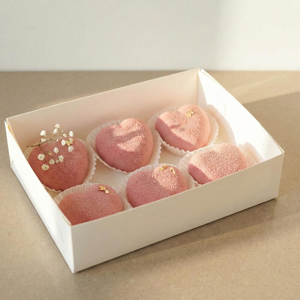 Corazones de mousse rosa artesanal – 6 unidades Base interior de bizcocho suave – 6 unidades Cobertura efecto velvet rosa – 6 unidades Decoración delicada (pan de oro comestible y flor seca) – cantidad decorativa Caja rígida blanca para presentación – 1 unidad