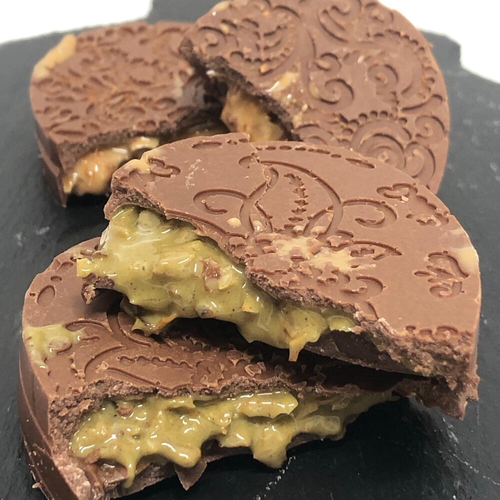 Disfruta del delicioso y viral chocolate Dubái. Espectacular mezcla de chocolate con leche y cremoso de pistacho o de almendras. Cuando lo muerdes tiene un toque crujiente que lo complementa para más deleite.