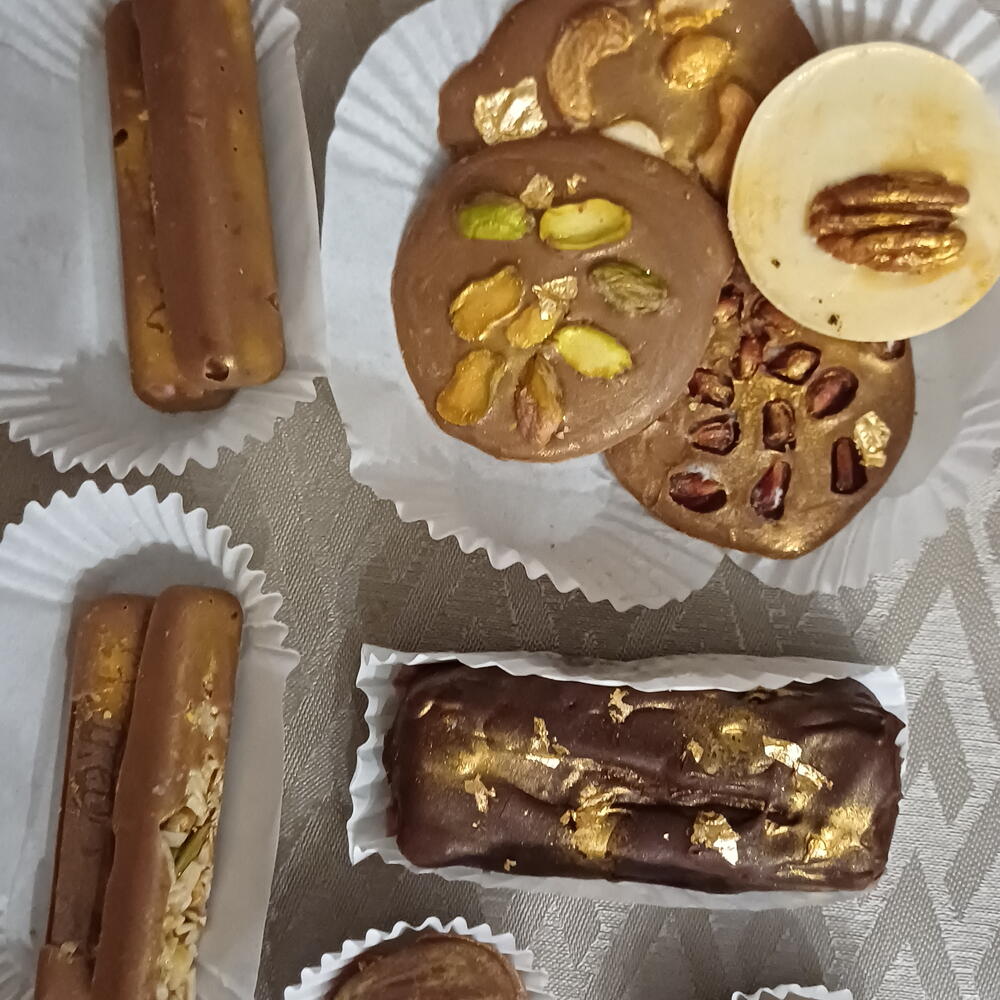 chocolate belga Callebaut frutos seco: almendras pasas pistacho avellanas oro comestible frutas deshidratadas (fresa y fruta de dragón) granada fresca