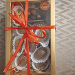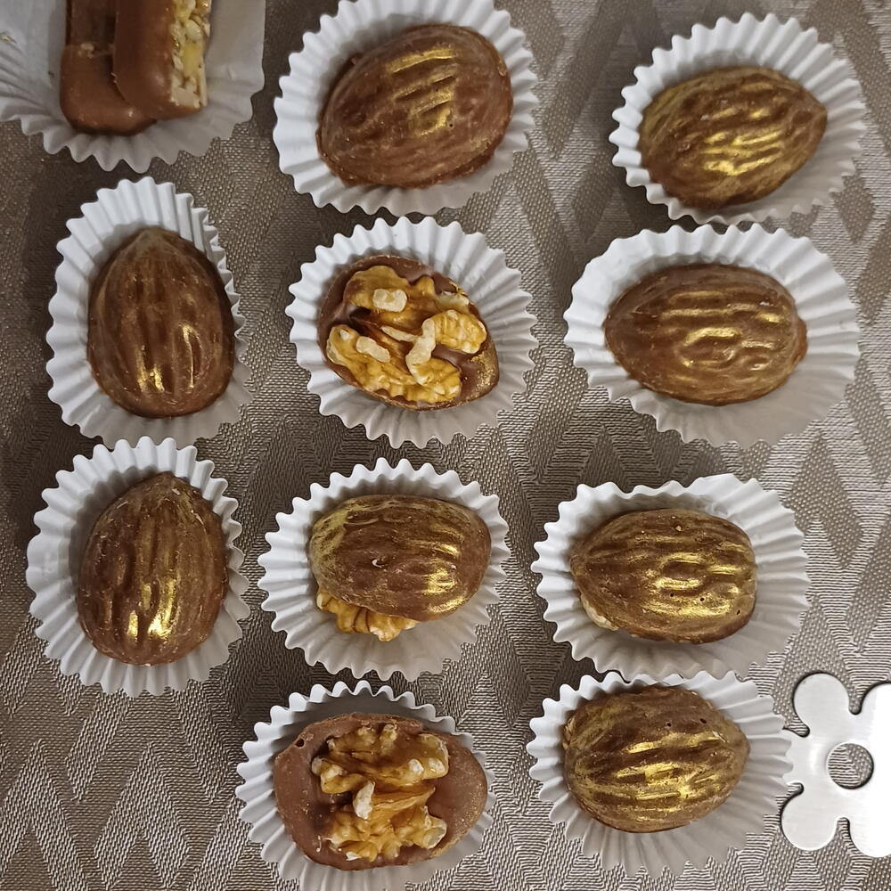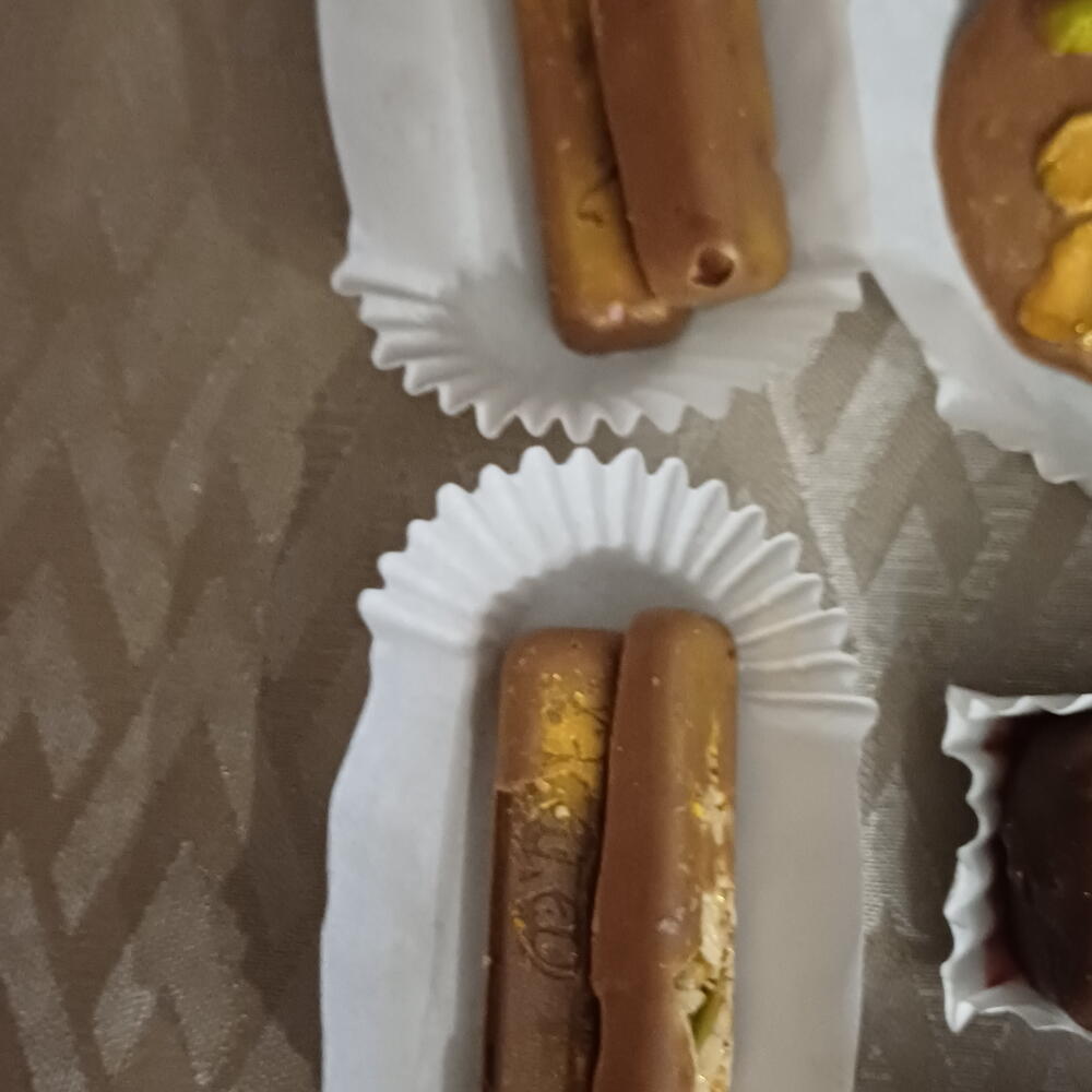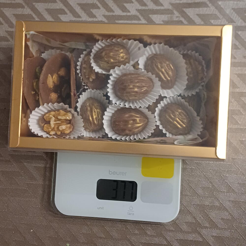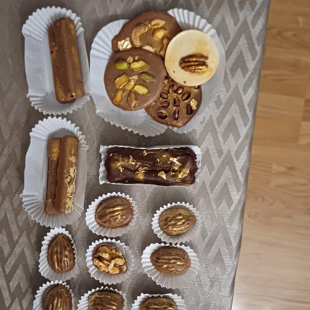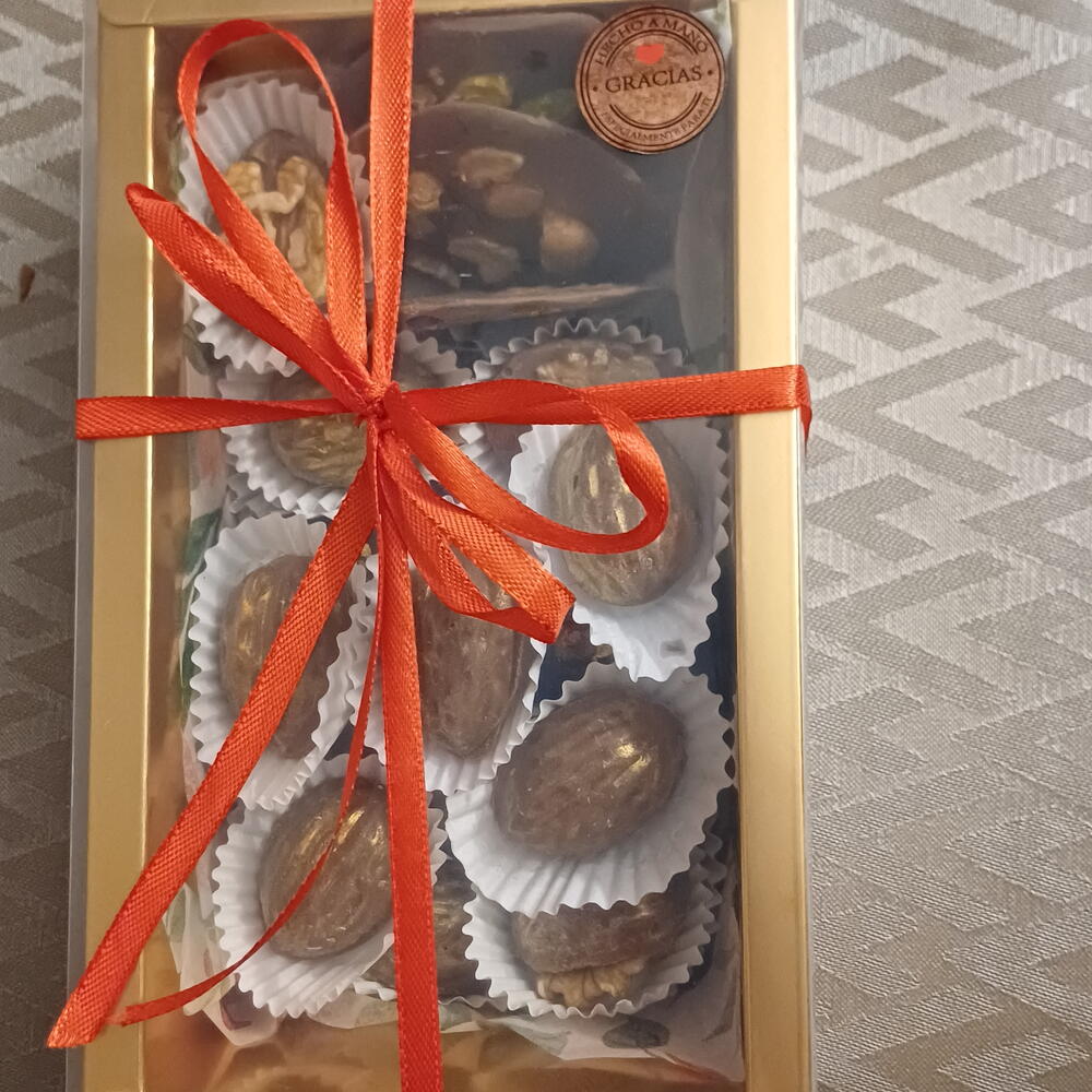 Elegante caja de dulces de chocolate artesanales, elaborados con ingredientes seleccionados y acabados a mano. En su interior encontrarás una deliciosa variedad: • Barritas de chocolate suaves y cremosas, con un equilibrio perfecto entre cacao y dulzor. • Medallones de chocolate finos y delicados, ideales para disfrutar en cada bocado. • Bombones con forma de nuez, rellenos y decorados con detalle, que combinan textura crujiente y sabor intenso. Cada pieza está creada de forma artesanal, cuidando el brillo, la textura y el sabor auténtico del chocolate. Una caja perfecta para regalar o para darte un capricho especial.