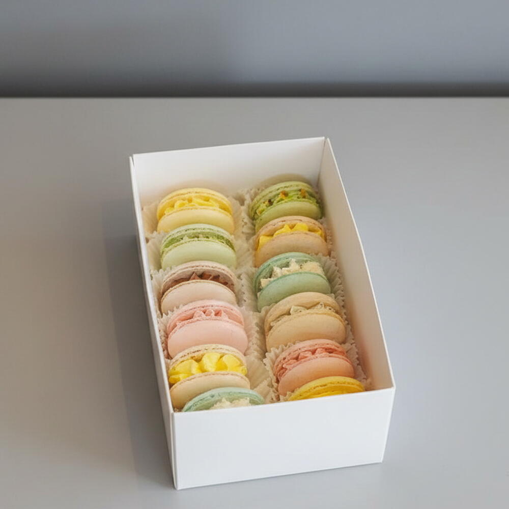 Caja elegante con 12 macarons artesanales en una selección de sabores variados. Cada macaron está elaborado con base de almendra fina y rellenos cremosos de diferentes colores y aromas: vainilla, pistacho, limón, chocolate, frutos rojos y más. Presentados en cápsulas individuales para mantener su frescura y vistosidad. Perfectos para regalo, celebraciones o simplemente para disfrutar de un capricho dulce.