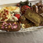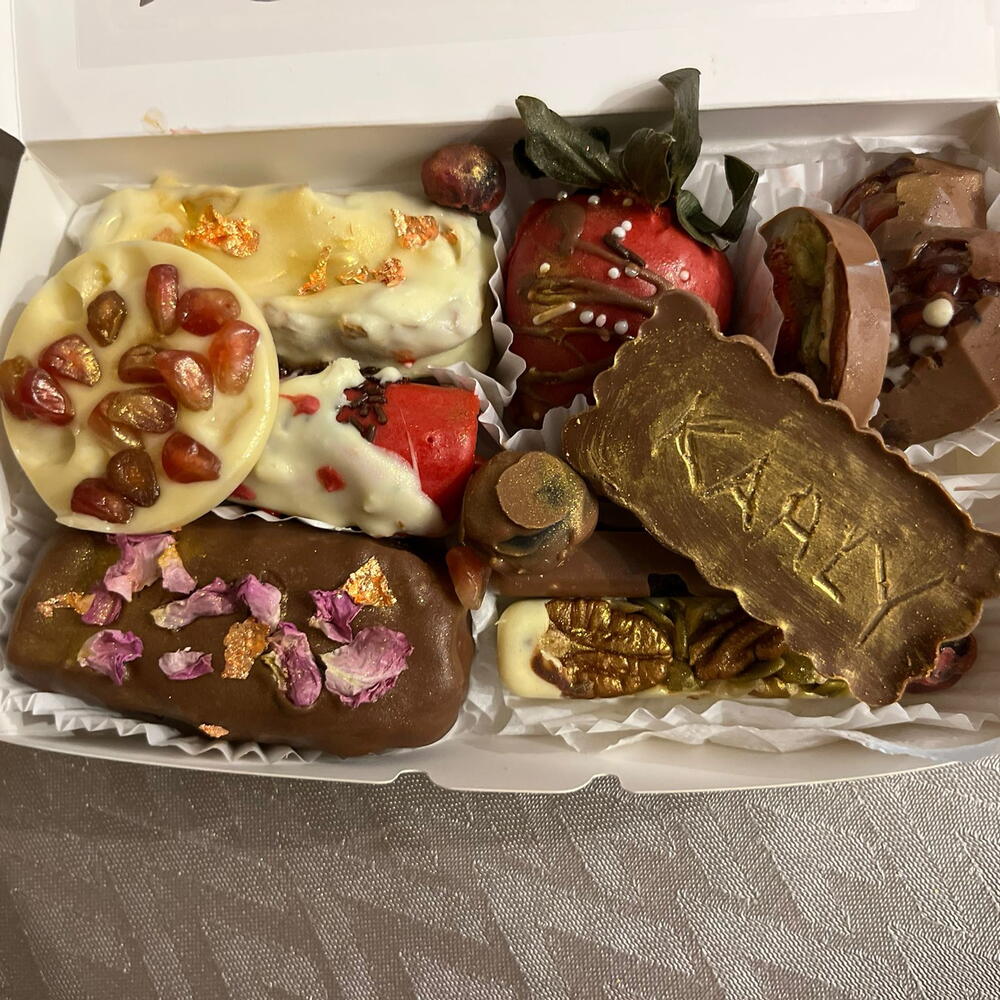 Una caja de surtidos de chocolates para San Valentín es un regalo gastronómico pensado especialmente para celebrar el amor y el cariño. Se trata de una colección de chocolates artesanales y bombones de diferentes sabores, formas y texturas, empaquetados en una presentación atractiva (a menudo con motivos románticos como corazones o colores rojo y rosa). La caja tiene : 1 barra de chocolate belga con leche, relleno de crema de pistacho y crema de cacahuetes 1 barra de chocolate blanco belga relleno con crema de Lotus y crema de pistacho 1 Fresa con chocolate con leche Medio platano con chocolate con leche y chocolate blanco 1 medallon chocolate con leche 1 medallon chocolate blanco 1 bombon largo con frutos secos y chocolate con leche 1 bombon largo con frutos secos con chocolate blanco 4 arándanos con chocolate con leche y blanco