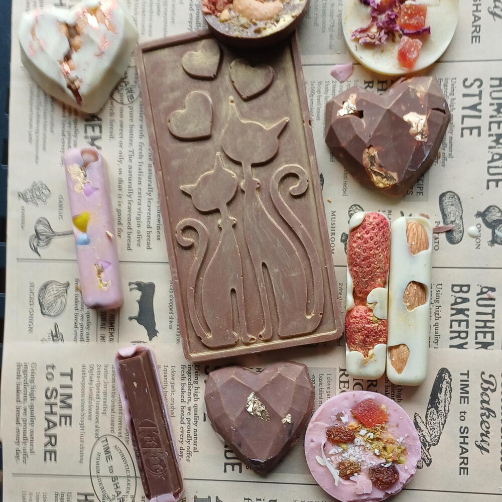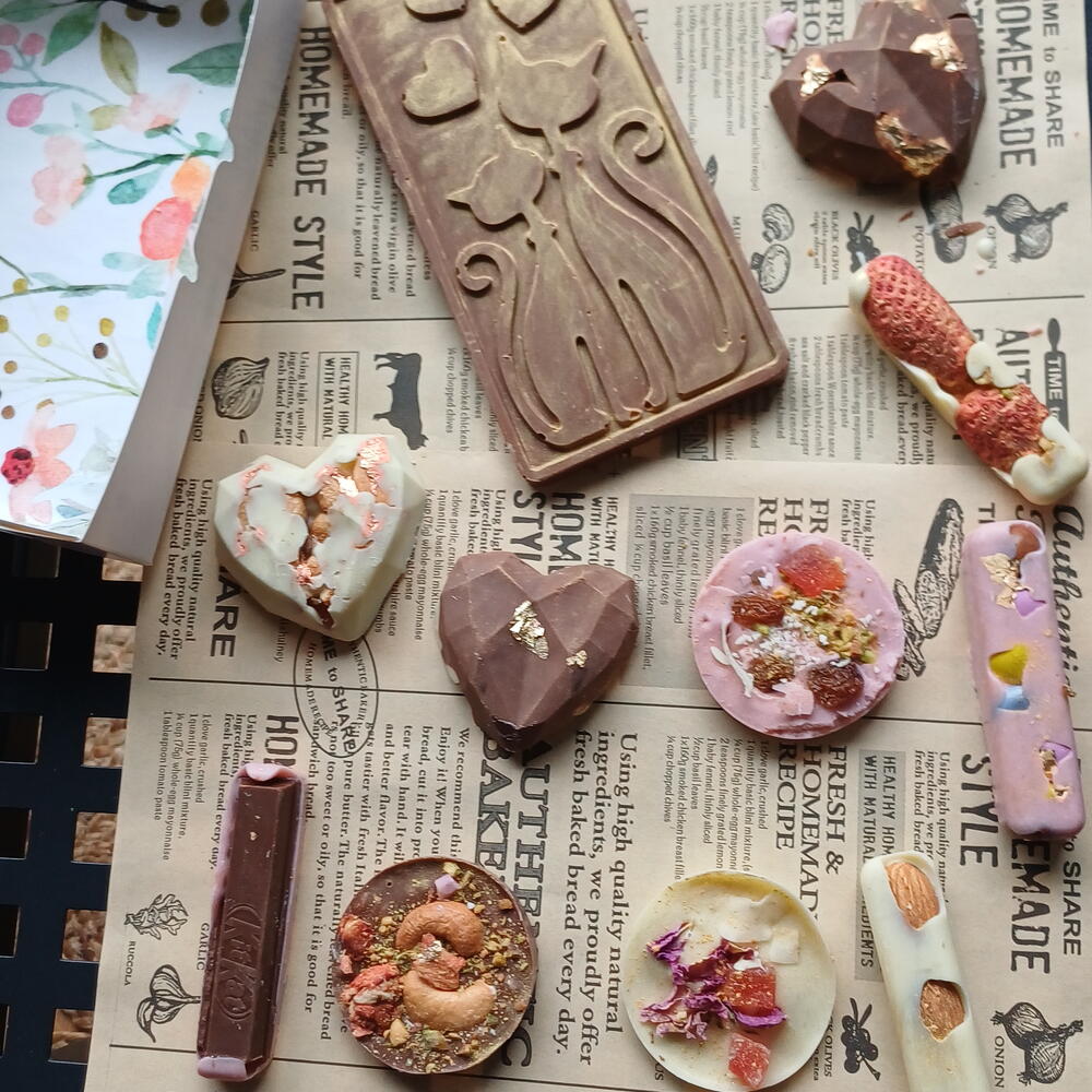 Incluye:Chocolate belga,frutos secos,frutas deshidratadas,laminas y polvo de or comestible,la casitos,barritas de kit-kat. Tableta de chocolate con diseño romántico de gatitos y corazones Corazones de chocolate decorados con toques dorados Fresas cubiertas con chocolate blanco y rosa Mini piezas con frutos secos, pétalos y frutas deshidratadas Barritas y bocados variados con acabados elegantes