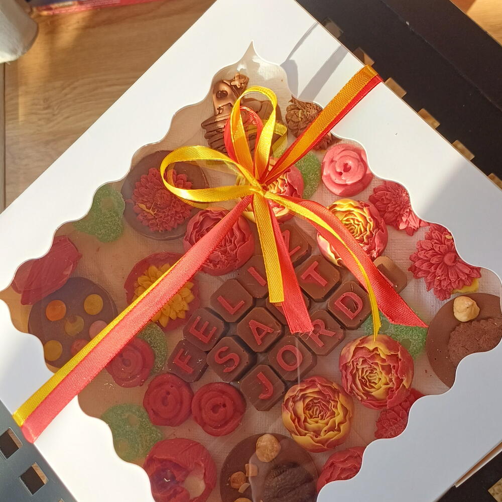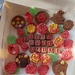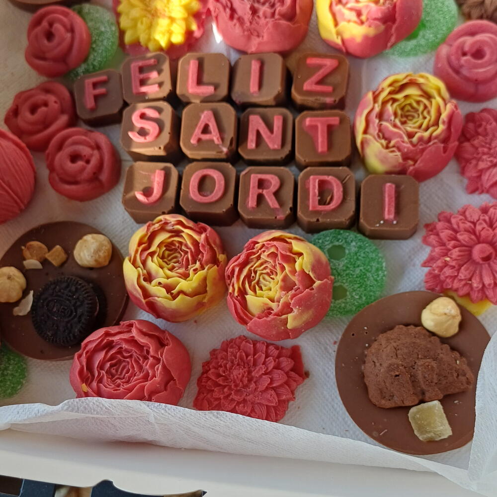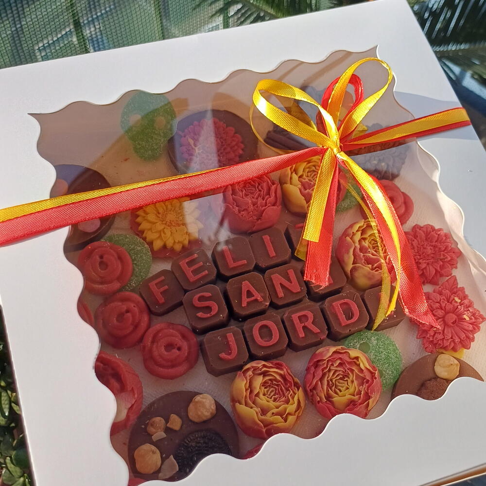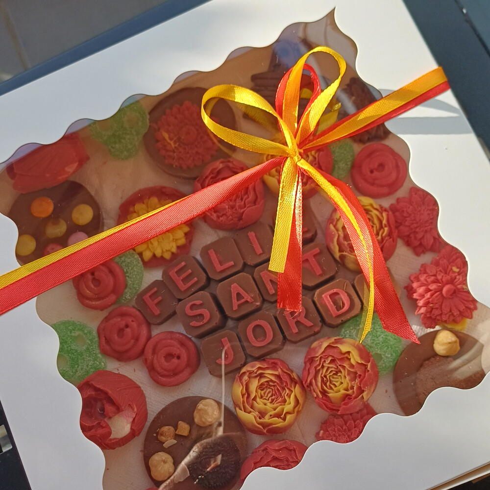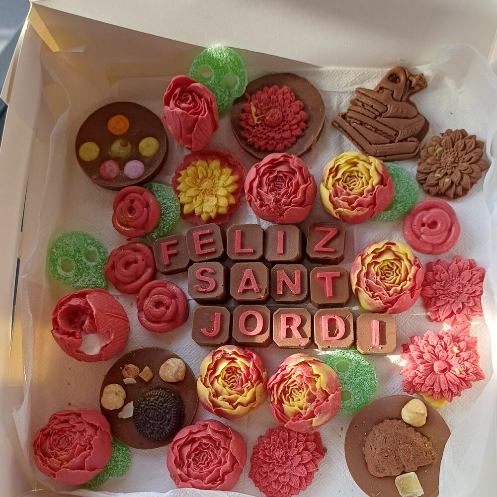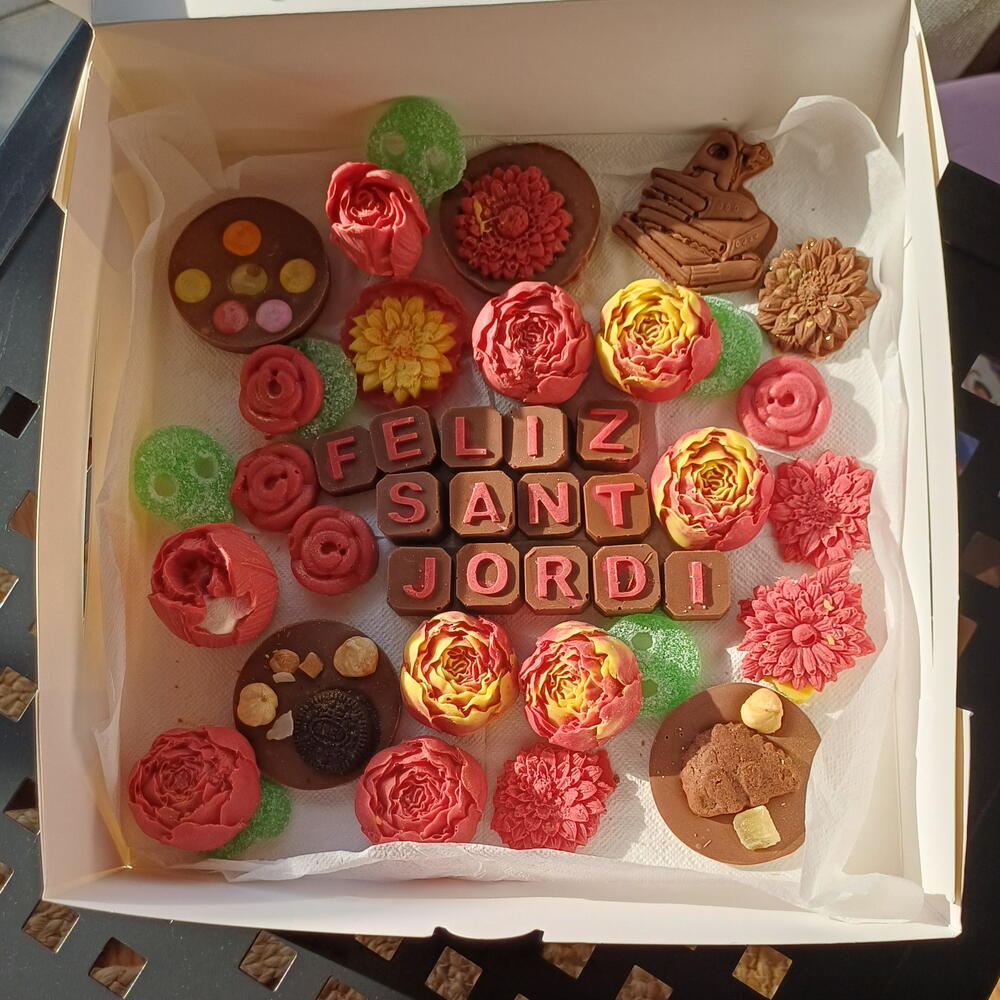 Una caja artesanal llena de detalles únicos para celebrar Sant Jordi: chocolates decorados en forma de flores, bombones personalizados con “Feliz Sant Jordi”, galletas y dulces cuidadosamente elaborados a mano. Una combinación perfecta de sabor y estética, ideal para regalar amor, tradición y dulzura en un solo detalle especial.