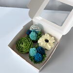 Una elegante caja de 6 cupcakes decorados con delicadas flores en tonos verdes y azules, diseñados especialmente para celebrar el Día del Padre. Cada cupcake está elaborado a mano con técnicas de repostería artística, creando pétalos realistas y una presentación única.