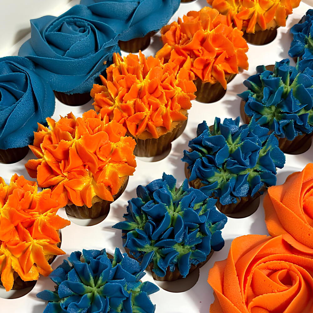 Una impresionante colección de 24 cupcakes decorados a mano con flores grandes y vistosas en tonos azul petróleo, naranja intenso y azul profundo. La combinación de colores crea un impacto visual vibrante y moderno, ideal para celebraciones llenas de energía y estilo.