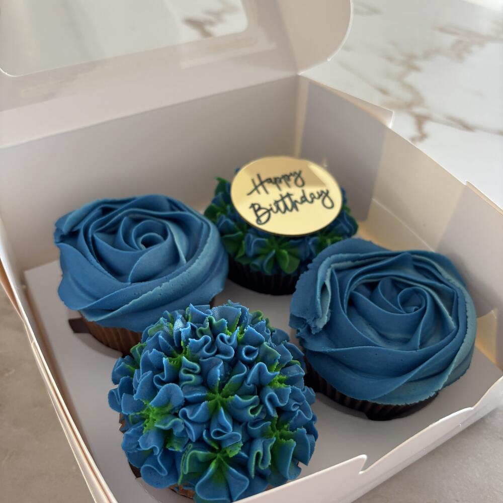 Delicada y elegante, nuestra Caja Pétalos incluye 4 cupcakes florales con diseño premium, decorados con flores altamente detalladas que parecen pequeñas obras de arte comestible. • Diseño: Rosette azul y hortensias azul con verde • Sabor: Bizcocho de vainilla o Chocolate. • Decoración: Hecha a mano con buttercream (crema de mantequilla) cremosa. • Relleno: Se puede incluir relleno de dulce de leche, nutella o crema de pistacho.