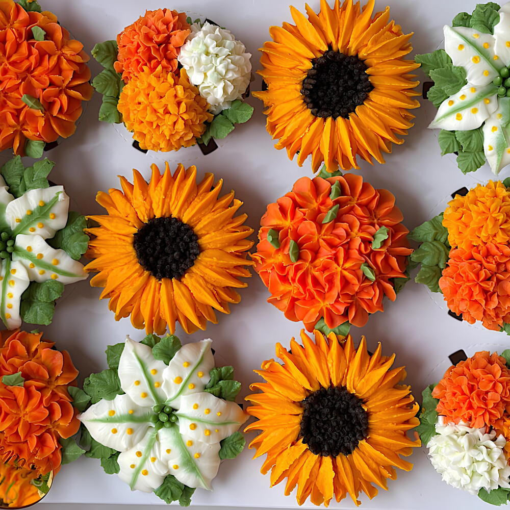 Cada cupcake está elaborado con precisión artesanal, formando pétalos realistas y volúmenes exuberantes que convierten este conjunto en una verdadera obra de arte repostera. Ideal para celebraciones de temporada, cumpleaños, regalos especiales o mesas dulces que buscan un toque natural y colorido.