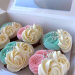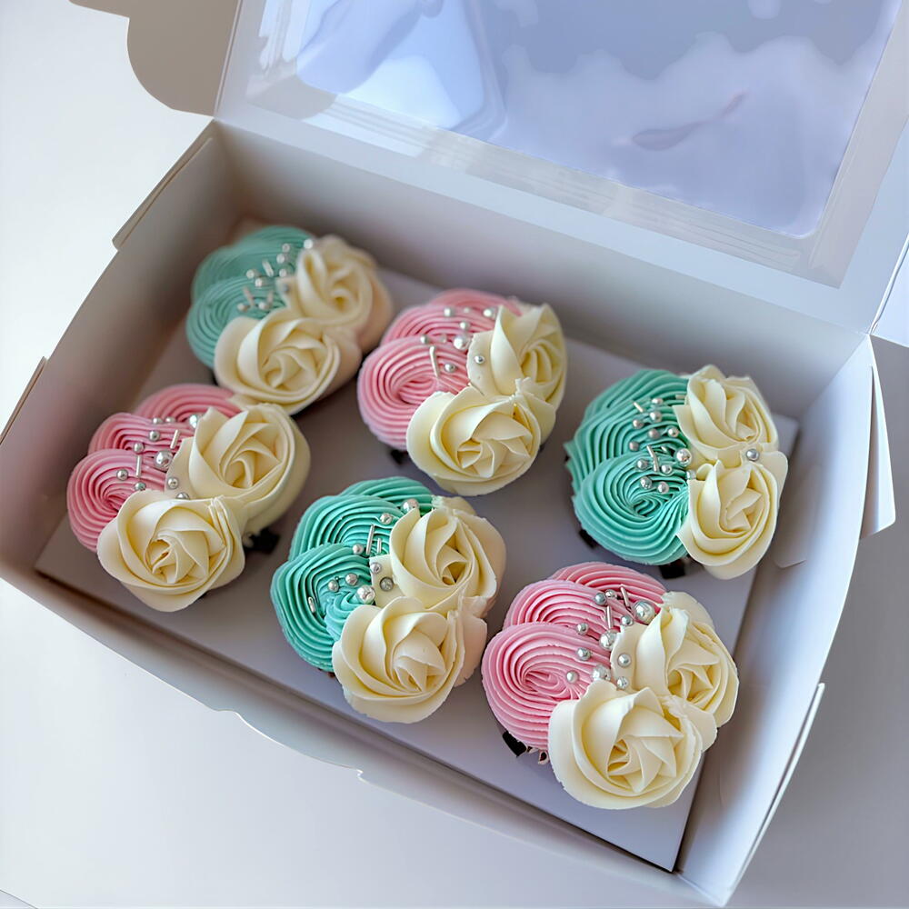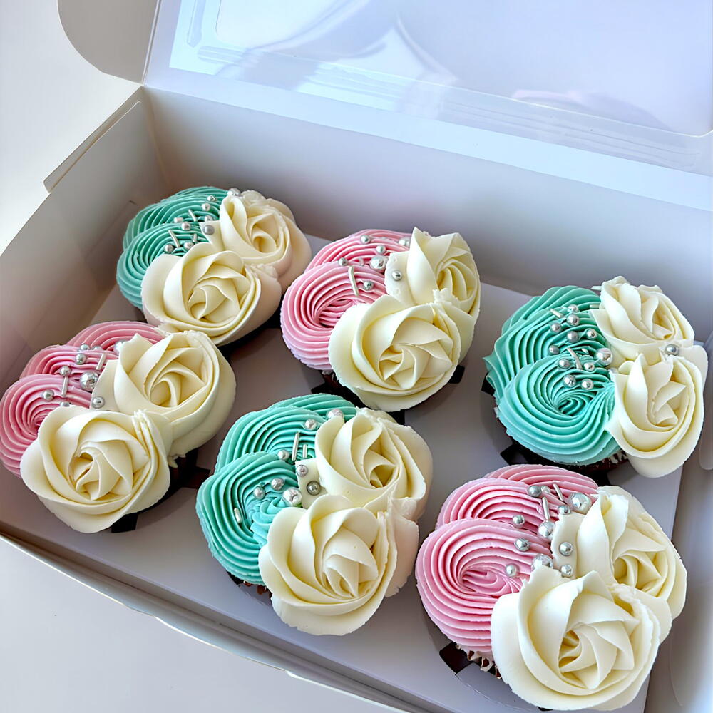 Un delicado conjunto de 6 cupcakes de gender reveal, decorados con suaves remolinos de crema en azul clarito y rosa pastel, evocando ternura y sorpresa. Los detalles en crema, sutiles y armoniosos, se complementan con pequeñas perlas comestibles que aportan un toque elegante y festivo, convirtiendo cada cupcake en una dulce antesala al gran anuncio.