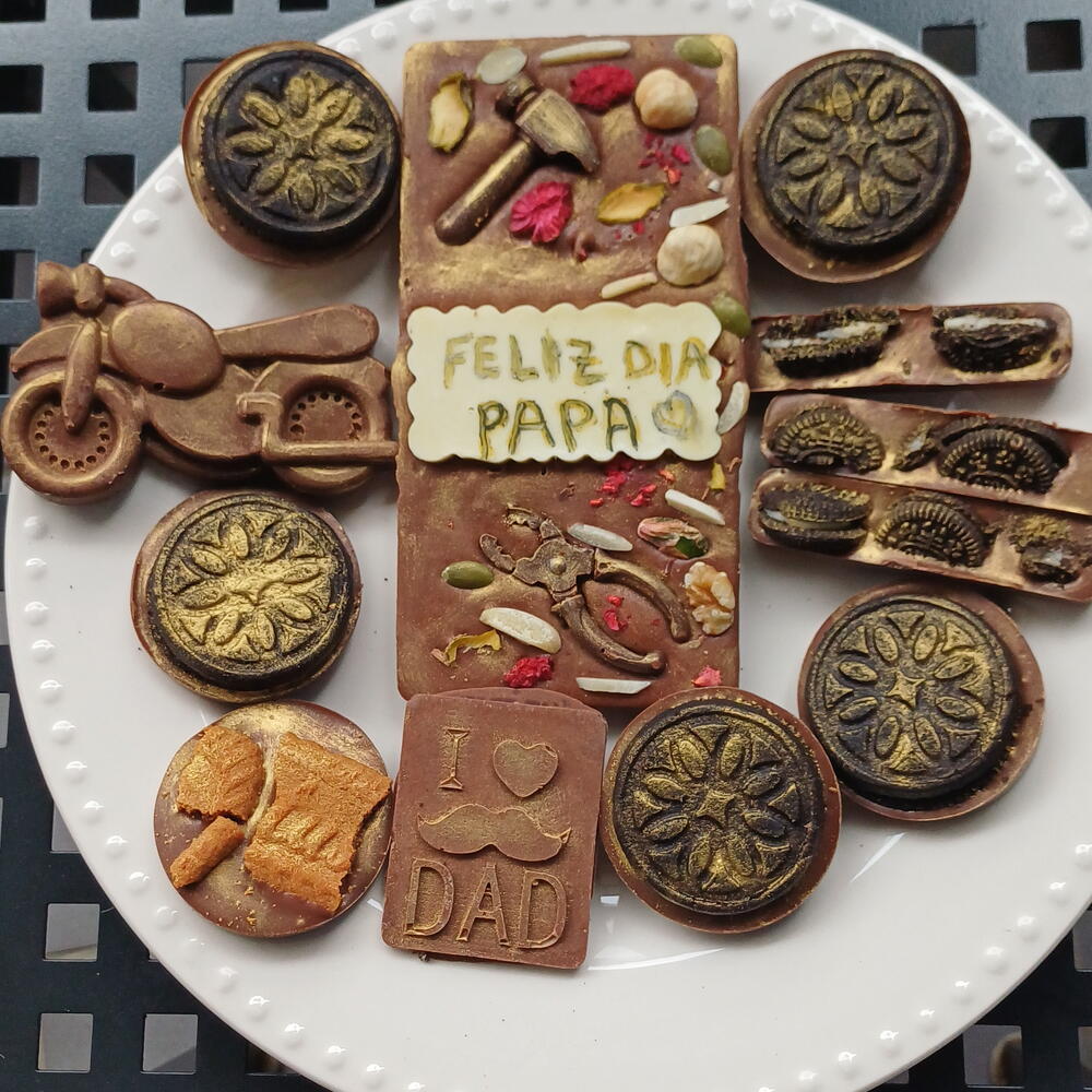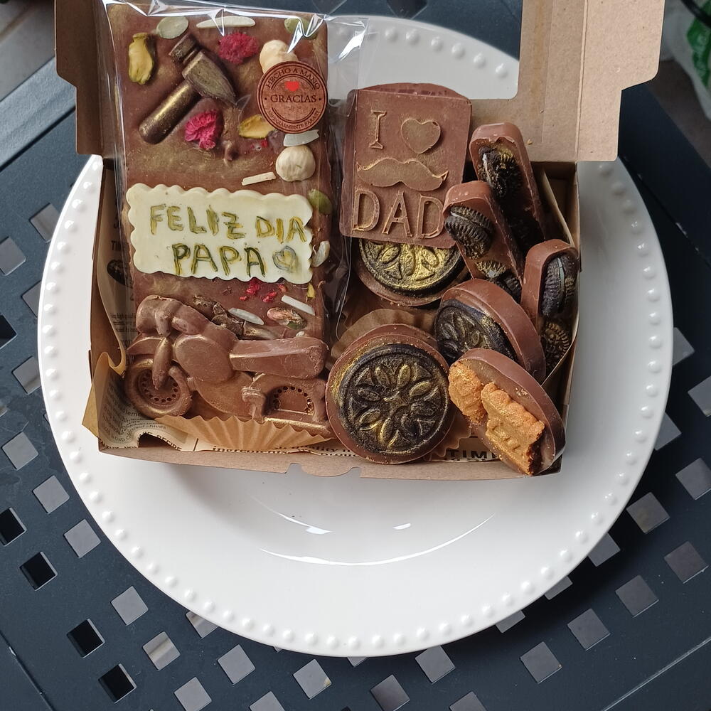 "¡Hecho con todo el amor del mundo para mi héroe favorito! 💛🔧 Esta tableta de chocolate artesanal con 'I ❤️ DAD' y su bigote dorado, rodeada de herramientas, tuercas y frutos secos que tanto le gustan… porque papá siempre está arreglando todo, ¡hasta nuestros días! Y para completar el detalle: bombones con formas de coche clásico 🚗, barritas crujientes con Oreo , y más sorpresas llenas de sabor y cariño. Porque un papá como el mío merece lo mejor, no solo en su día ,sino siempre.