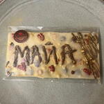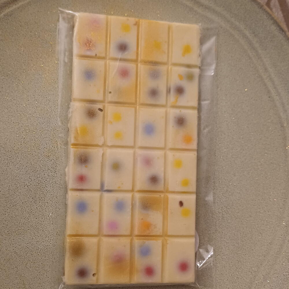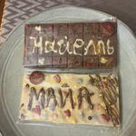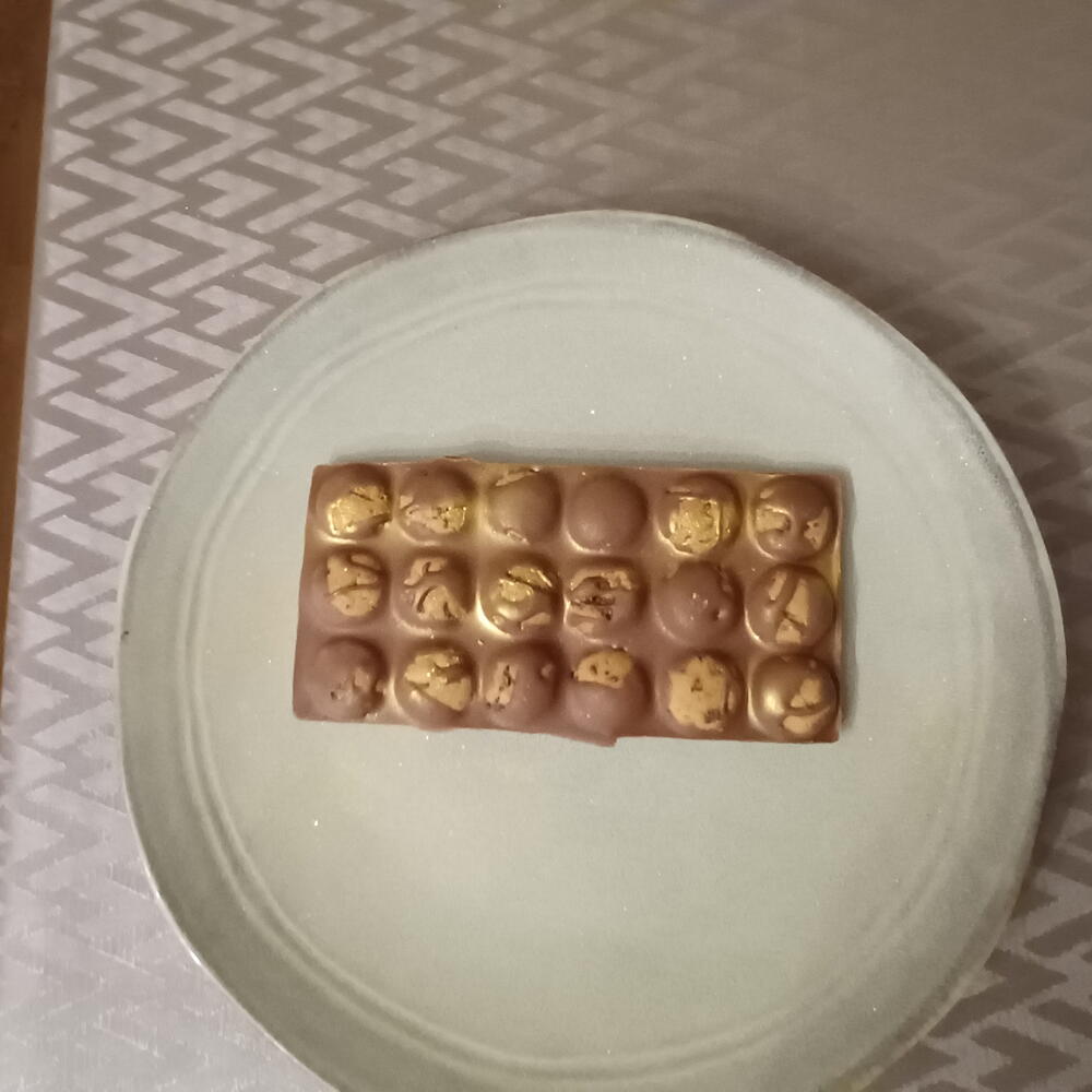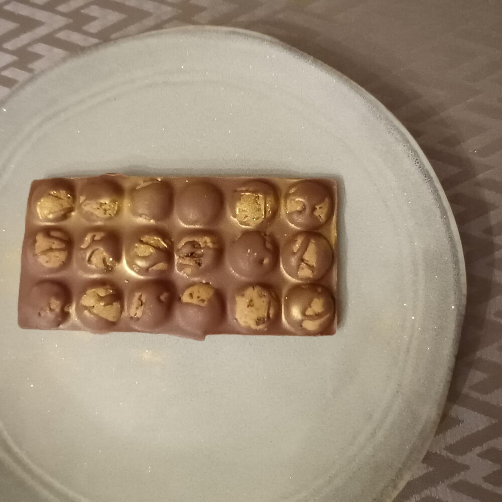 Chocolate de alta calidad (según elección: chocolate con leche, chocolate blanco o chocolate negro), azúcar, manteca de cacao, leche en polvo (en chocolate con leche y blanco), cacao, frutos secos (pistacho, avellana u otros, según diseño), galleta crujiente (opcional), oro comestible (opcional), aroma natural de vainilla. ⚠️ Alérgenos: Contiene leche, frutos secos y gluten (si incluye galleta). Puede contener trazas de soja y otros frutos secos.