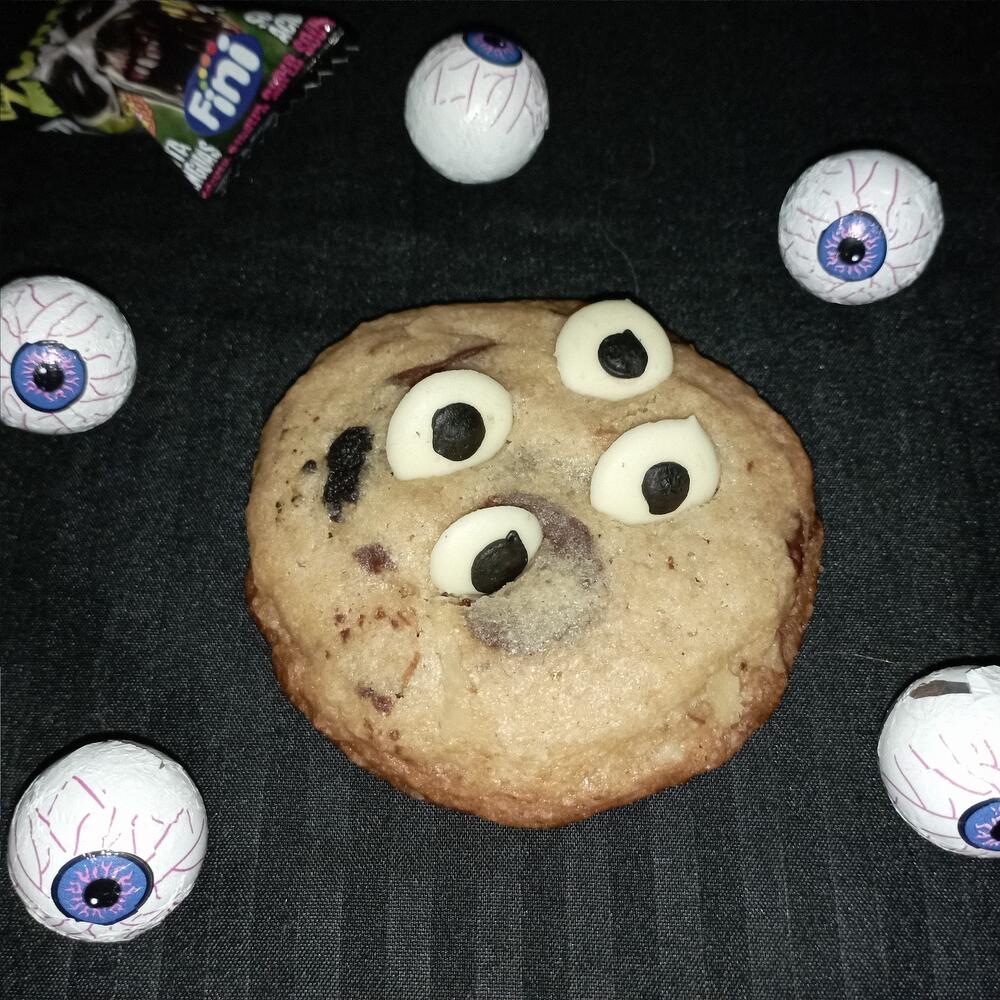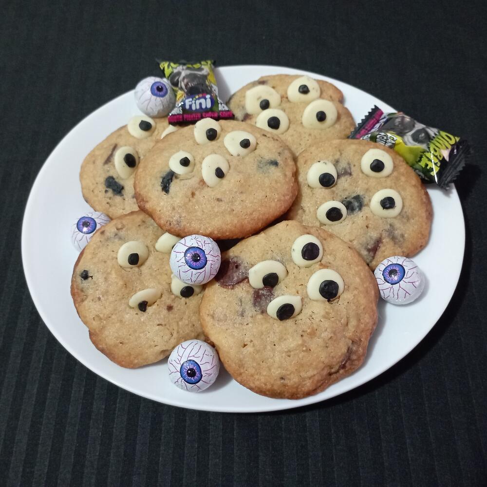 Deleite con estas cookies exquisitas hechas con ingredientes de primera calidad como la harina,la mantequilla y los huevos frescos. Un sabor realzado con las pepitas de chocolate negro y las nueces. Y para el colmo decoradas con ojos terroríficos 👹 ideales para una noche especial Halloween 🎃 a qué espera,corre se acerca Halloween que no te falten cookies!