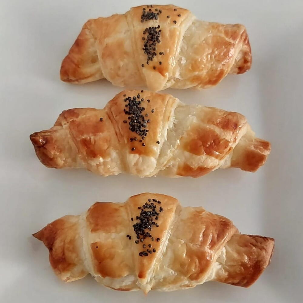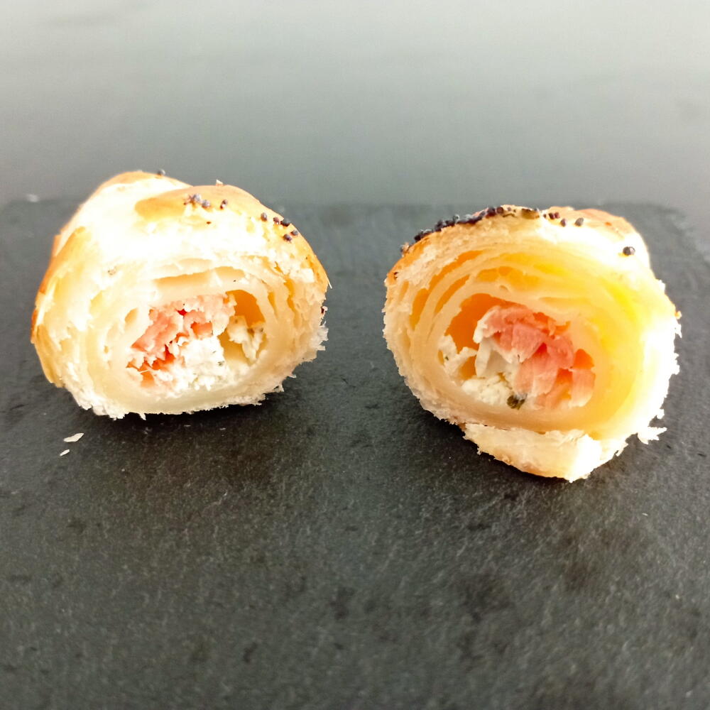Estos deliciosos croisanes son elaboradas con una exquisita masa de hojaldre combinada con mantequilla, te deleitarán con su interior lleno de queso de finas hierbas y salmón ahumado. Cada mordida es enriquecida con la textura de huevos y el crujiente de las semillas de amapola. Son el bocadillo perfecto para cualquier momento del día o para un aperitivo
