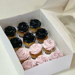 Caja de 12 cupcakes decorados con crema en forma de rosa en dos tonos contrastantes: negro intenso y rosa pastel. Su estilo moderno y sofisticado los hace ideales para celebraciones elegantes, combinando delicadeza y un toque atrevido en cada bocado.
