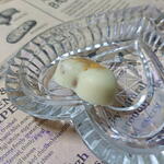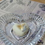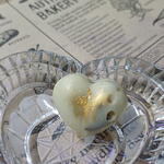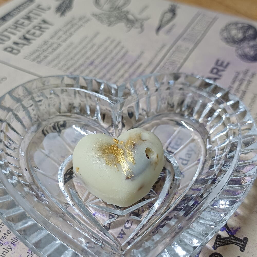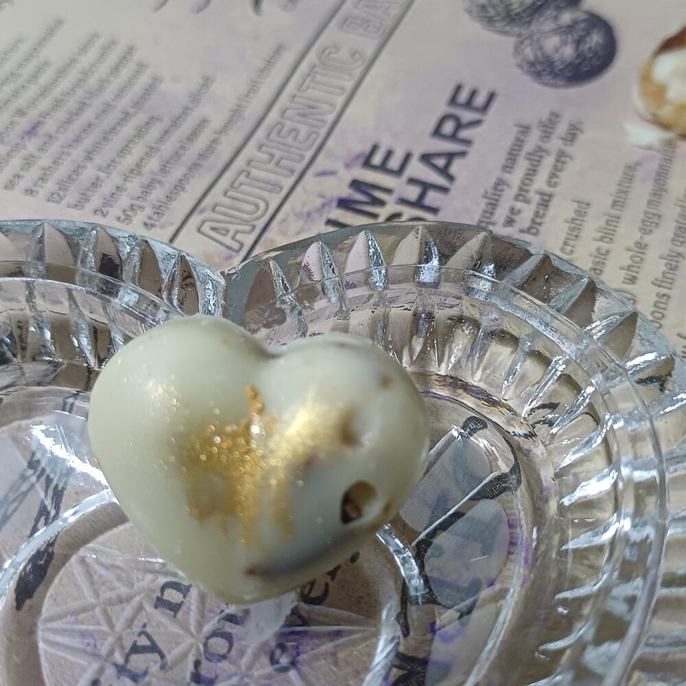 Bombones con chocolate blanco en forma de corazon con frutos secos ,decoradas con pan de oro