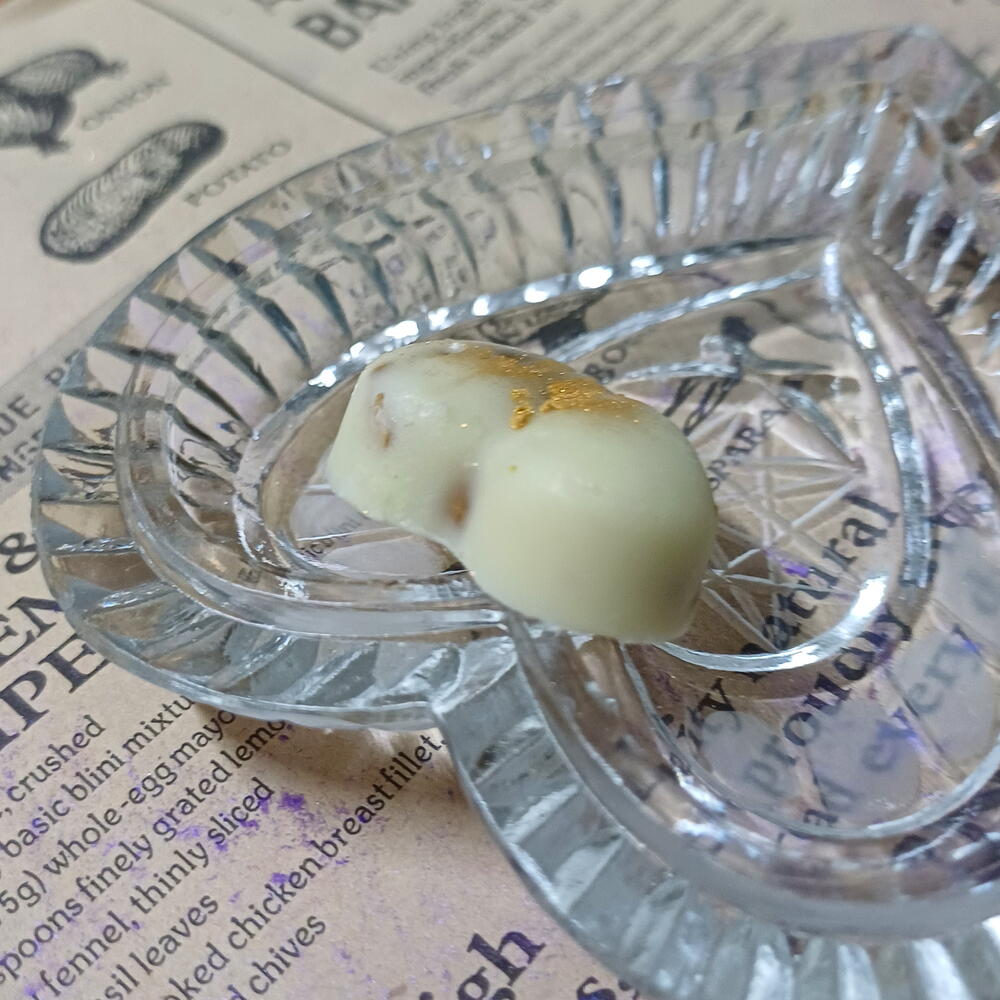 Bombón artesanal de chocolate blanco cremoso, elaborado a mano y enriquecido con frutos secos seleccionados que aportan un delicado contraste crujiente. Decorado con pan de oro comestible 23–24K, es una pieza elegante y romántica, perfecta para regalos especiales y ocasiones únicas