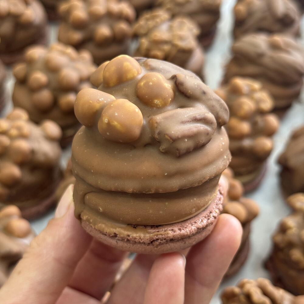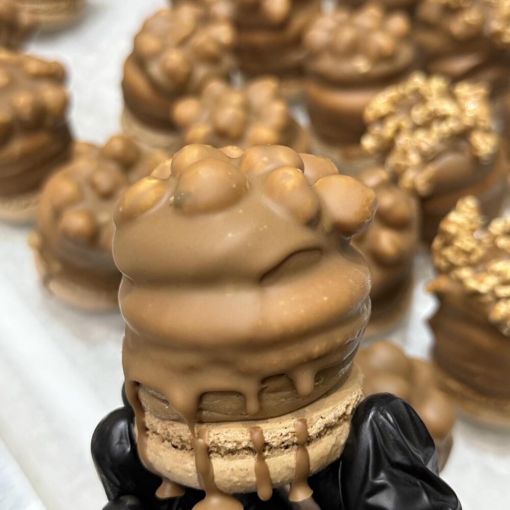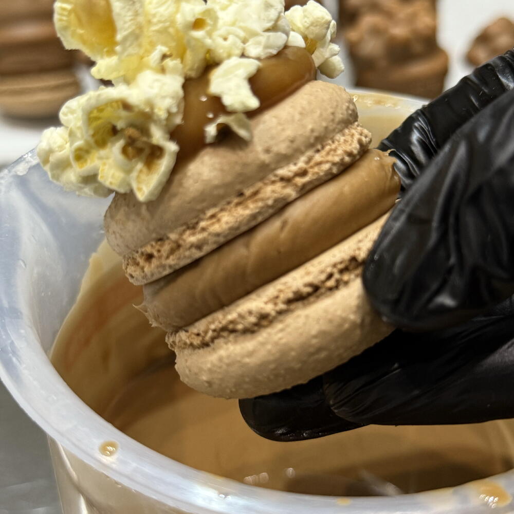 Macaroni con ganache de chocolate, con caramelo y avellanas, o palomitas saladas en glaseado de chocolate