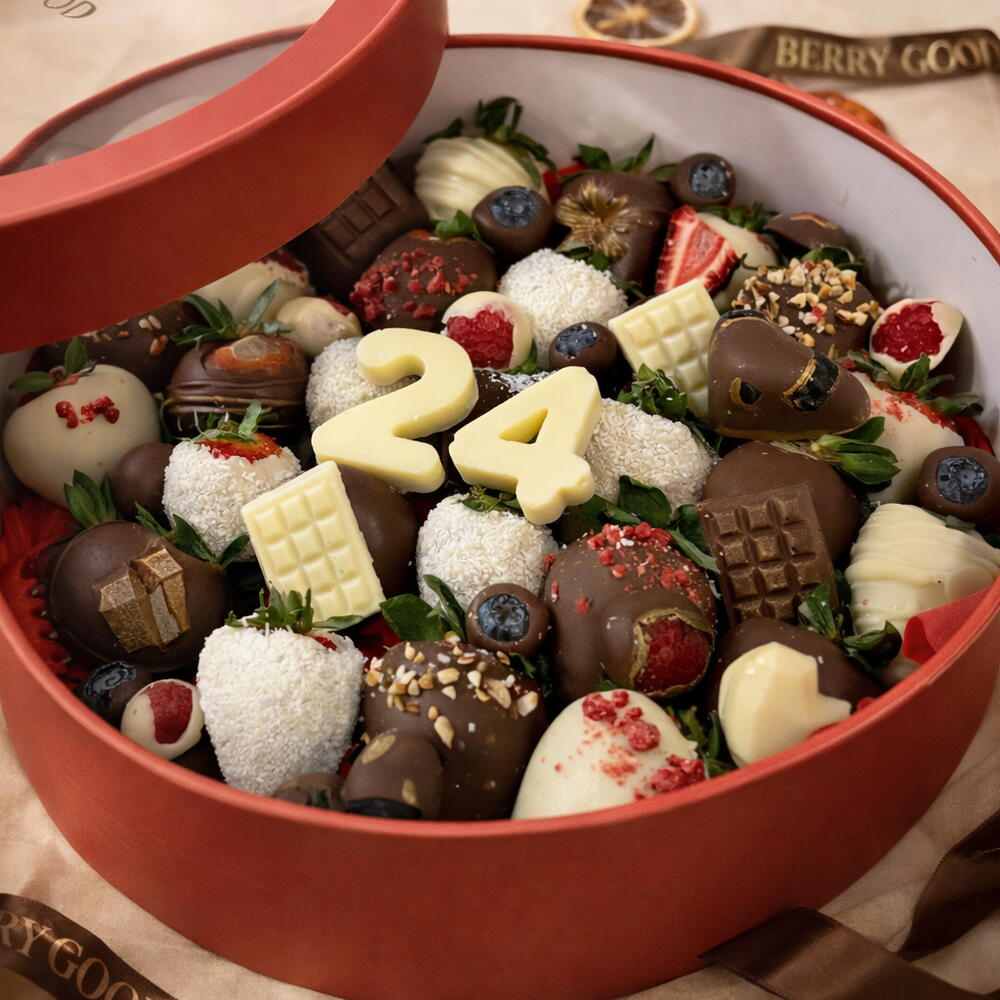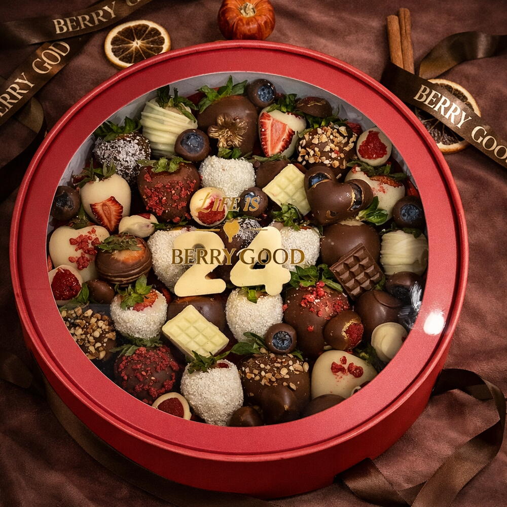 La Mini Berry Red Celebration es nuestra opción roja en formato más compacto: caja circular de 25 cm con unas 25 fresas bañadas en chocolate, acompañadas de frambuesas, arándanos, coco y números de chocolate en el centro. La tapa transparente deja ver el interior nada más recibirla: amor a primera vista. Perfecta para cumpleaños, graduaciones o pequeños grandes logros. Es 100 % customizable: puedes elegir el número o mensaje, la combinación de chocolates, el color del lazo y el estilo decorativo para adaptarla a cualquier celebración. Cantidad de fresas orientativa según calibre. Y, por supuesto, todo es gluten free.