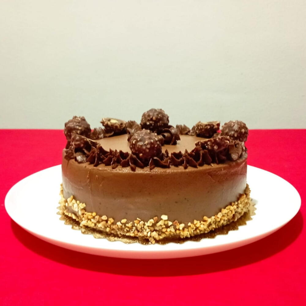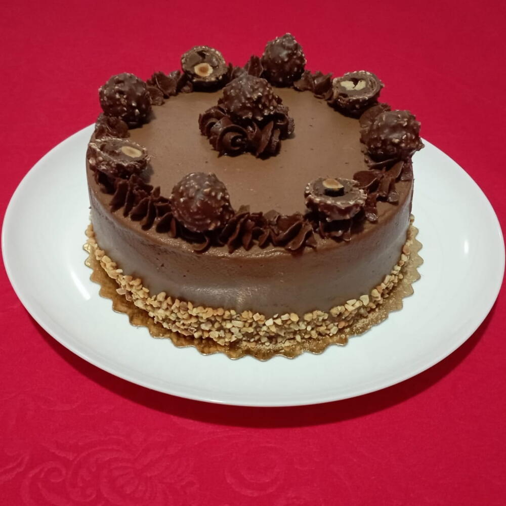 Deléitate con esta deliciosa tartas, artesanalmente preparada con los más finos ingredientes: harina de calidad, azúcar, huevos frescos y cremosa mantequilla. Enriquecida con sabrosos frutos secos como avellanas y almendras y, para un toque final verdaderamente lujoso, adornada con exquisitos bombones Ferrero. Una auténtica indulgencia apta para los paladares más exigentes.