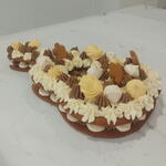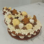 Elegante pastel de dos pisos inspirado en la forma y el espíritu de una guitarra. Está elaborado con suaves capas tipo pryanik (bizcocho especiado), relleno de crema de queso (cream cheese) montada con nata y una delicada namelaka de chocolate, que aporta una textura sedosa y profunda. El pastel está decorado con flores delicadas y merengue crujiente, creando un equilibrio entre dulzura, ligereza y un acabado artístico perfecto para celebraciones especiales.
