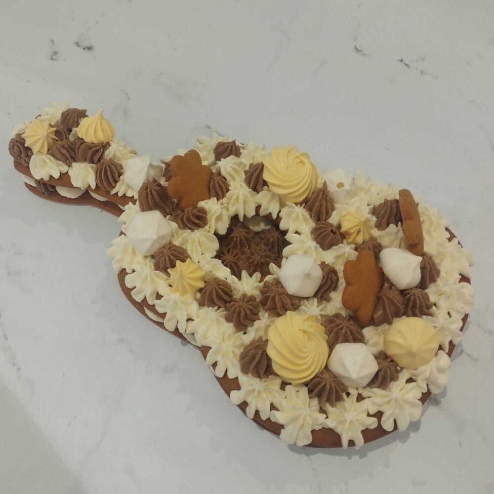 Elegante pastel de dos pisos inspirado en la forma y el espíritu de una guitarra. Está elaborado con suaves capas tipo pryanik (bizcocho especiado), relleno de crema de queso (cream cheese) montada con nata y una delicada namelaka de chocolate, que aporta una textura sedosa y profunda. El pastel está decorado con flores delicadas y merengue crujiente, creando un equilibrio entre dulzura, ligereza y un acabado artístico perfecto para celebraciones especiales.