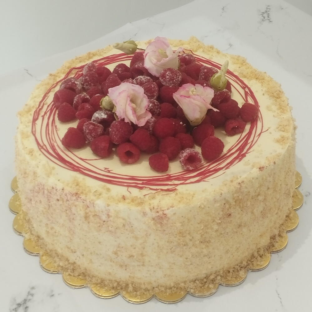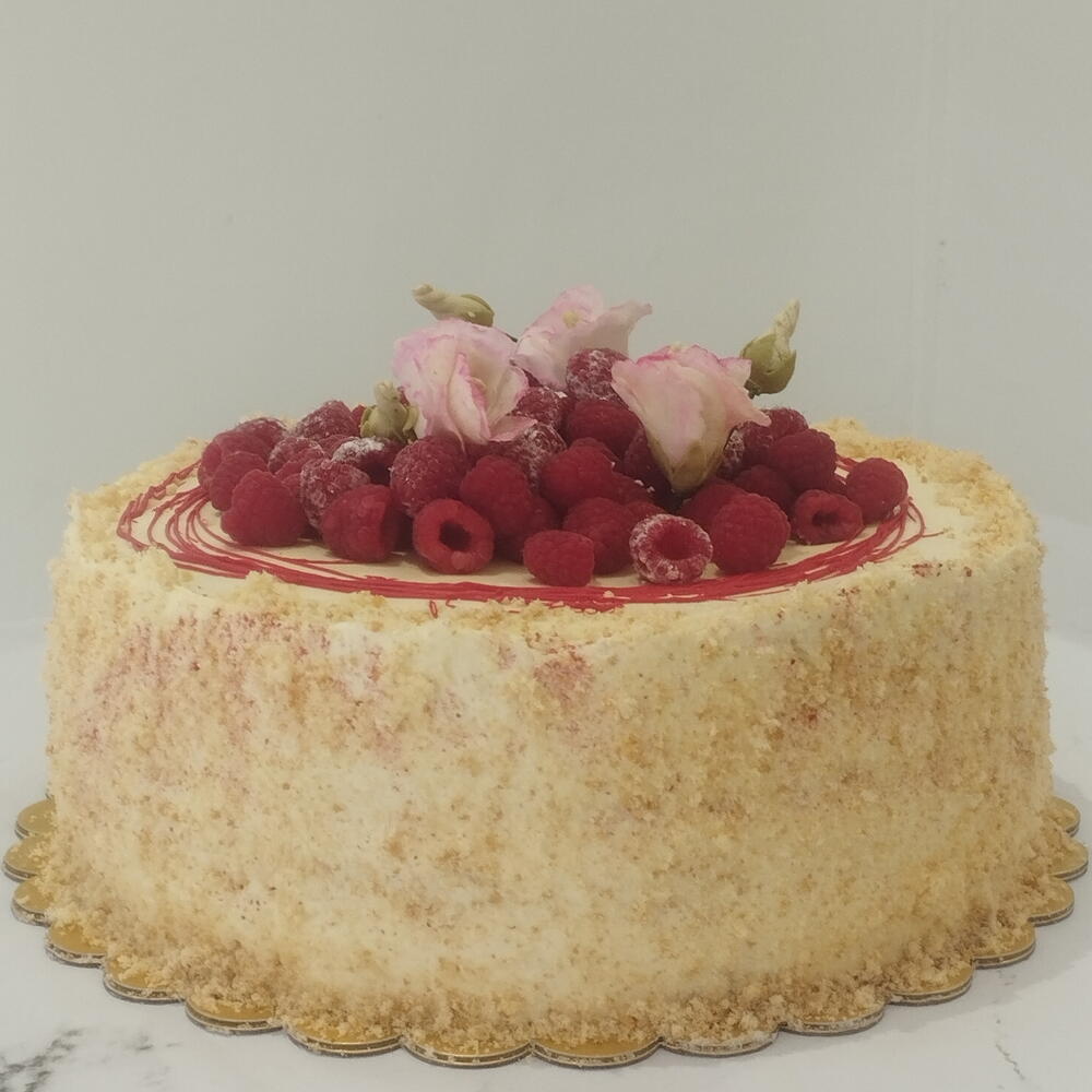 Descripción Gran pastel para boda civil, elegante y generoso, pensado para 25–30 personas. Con un peso de 5,5 kg, 32 cm de diámetro y 12–14 cm de altura, es un pastel realmente abundante y festivo. Capas de bizcochos blancos muy suaves se combinan con una intensa crema de frambuesa o fresa, ganache de frambuesa y mermelada artesanal, creando un sabor profundo y equilibrado. Los laterales están cubiertos con migas de bizcocho, y la parte superior se decora con frutas frescas y flores comestibles, dando un acabado natural, romántico y sofisticado.