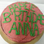 Delicioso bizcocho de vainilla (con opción de chocolate), cubierto con una capa de Buttercream de color rosa, y la frase de Happee BRTDHAE + (nombre de la persona) en buttercream de color verde.