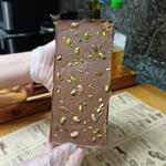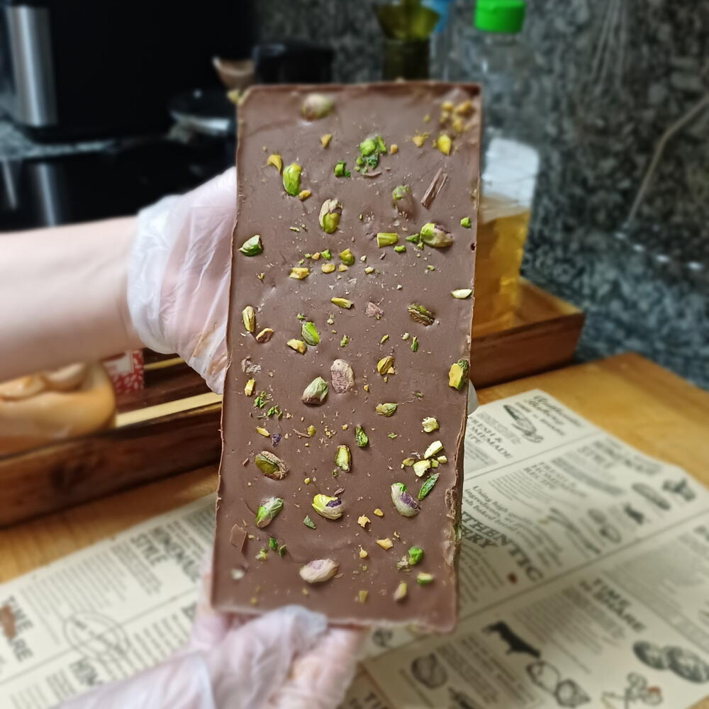 Chocolate con leche Crema de pistacho Cadaif turco Decoración:pintura y pan de oro comestibles