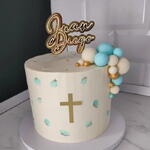 Tarta elegante de bautizo, decorada en color blanco crema con pinceladas en azul pastel y pequeños toques dorados. Lleva una cruz dorada en el frente y un arreglo lateral de bolas decorativas en tonos blanco, azul y dorado. Incluye topper personalizado con el nombre del niño. Perfecta para bautizos, primeras comuniones y celebraciones religiosas con un estilo moderno, limpio y sofisticado.
