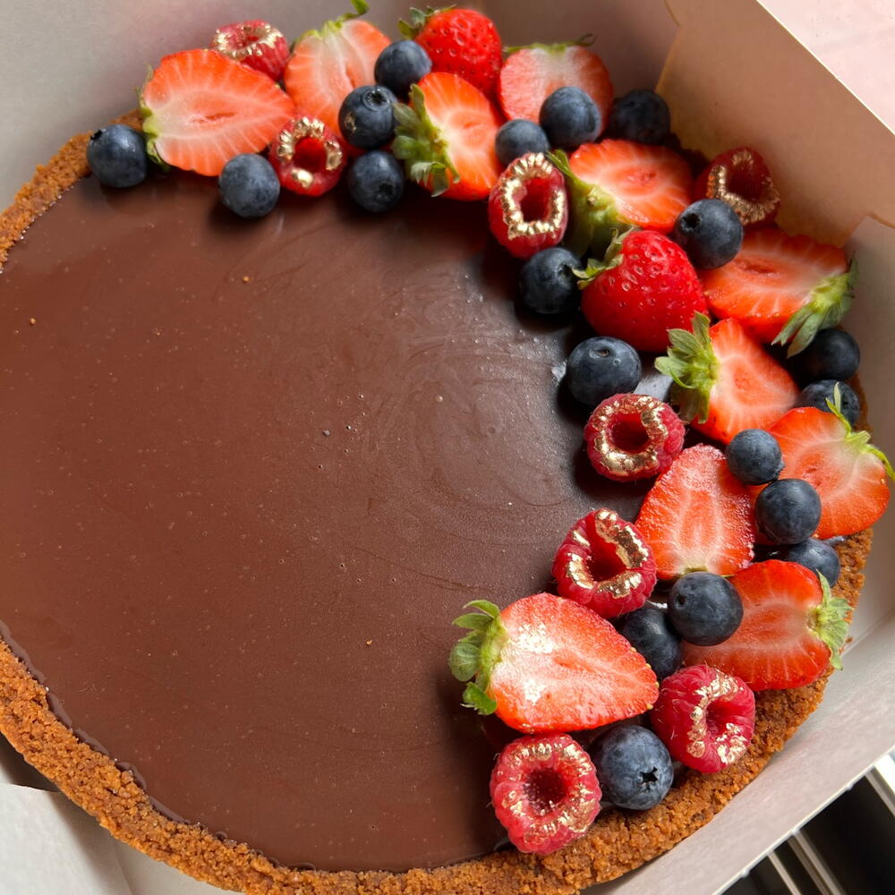 Tarta con base crujiente de chocolate, salsa de frutos rojos, ganache de chocolate y frutos rojos frescos, La ganache puede ser de chocolate leche o chocolate negro. 6 porciones