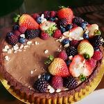 Tarta con base crujiente de chocolate, salsa de frutos rojos, ganache de chocolate y frutos rojos frescos.