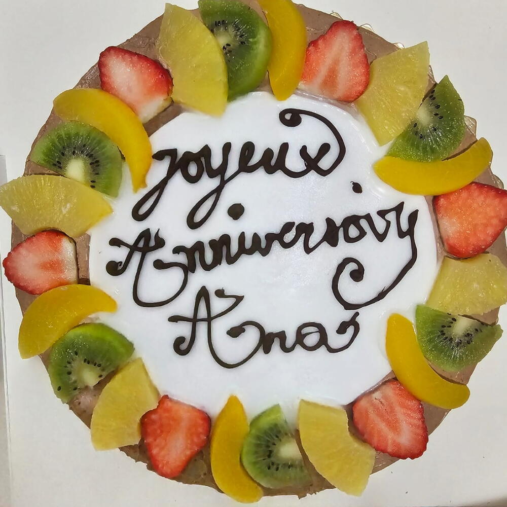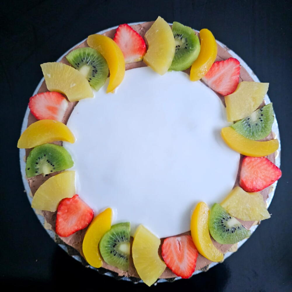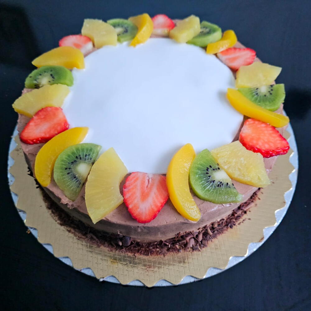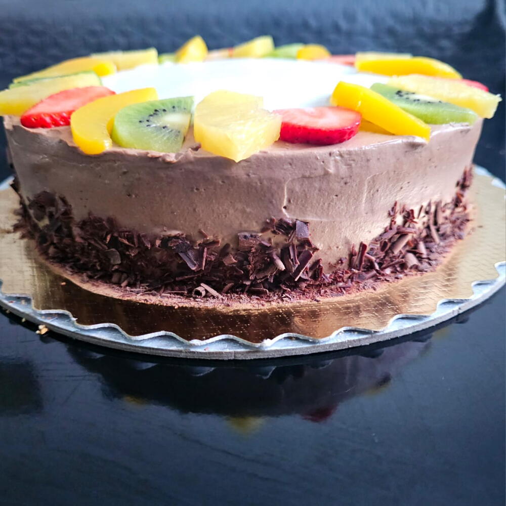 Deleite con nuestra tarta de chocolate sin gluten y con fruta hecha con ingredientes de primera calidad como los huevos,la harina,el cacao y la fruta fresca. Una explosión de sabor en cada bocado para los amantes del chocolate. La acidez de la fruta combina muy bien con la dulzura del chocolate. Es un bizcocho genovés muy esponjoso,hecho de harina libre de gluten como la harina de almendras y la maicena. Está rellenado de Whipped Ganache de chocolate praliné y fresquita fruta: fresas 🍓, kiwi 🥝, melocotón al almíbar y piña . La decoración también es de Whipped Ganache y de fruta. Para cumpleaños se puede añadir una fina capa de fondan sin gluten. A qué esperas?